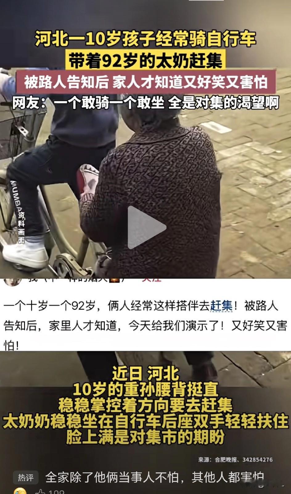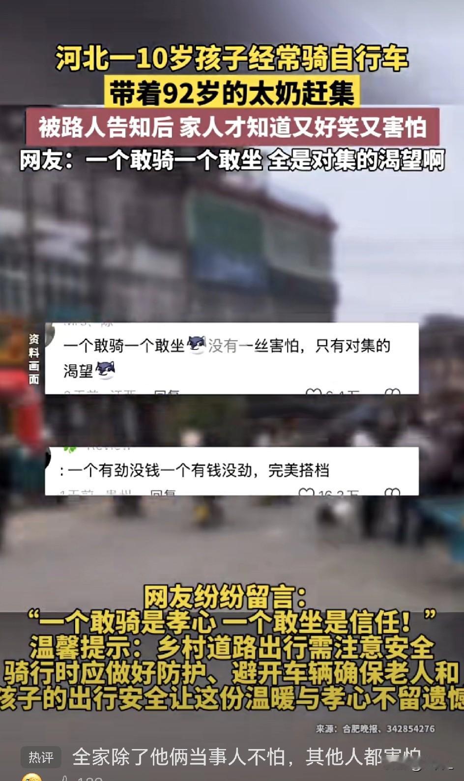 “我带着你,你带着钱!” 10岁男孩骑自行车载92岁太奶奶赶集,诠释跨世纪的爱与信任。网友:一个敢骑一个敢坐! 近日,河北,10岁的小男孩骑自行车带自己的92岁太奶奶赶集的视频,火上了热搜。 原本这一老一少,是偷偷去赶集的,被路过的邻居看到了,告诉家人,家人才知道这祖孙俩干了这么大一件事。 家人让这一老一少表演一下,俩人是怎么上街的。就见男孩扶好了车把,一脚撑地,然后太奶稳稳的坐在自行车的后座上,双手抓稳。男孩脚尖一点,脊背挺直,车子稳稳的向前行进。 祖孙俩满脸都是对赶集的渴望啊! 网友的评论,精彩绝伦: “一个走不动了,还想去街上看看热闹,一个冒险也要把太奶奶驼到街上去,因为街上有他爱吃的零食。互利互赢。” “我带着你,你带着钱,你没劲,我没钱,互利共赢!新脑子就是好使!” “全家除了他俩当事人不怕,其他人都害怕。” “我带着你 你带着钱,具象化了!” “一个无畏,一个无谓,跨世纪的信任!” “都是闯的年纪!” “一个敢骑,一个敢坐。除了他俩都吓出一身汗!” “在没钱的年纪遇到了有钱的太奶。” “一个敢骑,一个敢坐,后面吓死一帮!” “一个小小孩,一个老小孩最佳拍档!” 还有很多网友纷纷分享自己十几岁的年龄带着家里的爷爷奶奶、外公外婆去走亲戚赶集的趣事,当时觉着自己挺厉害,现在回想起来都是后怕。 想起我上大学时候,曾带着男朋友去看我姥姥,然后我也不知道我姥姥啥时候约了我男朋友,让我男朋友带着她回娘家。 那时候不通车,去哪儿走亲戚只能自己骑自行车,那时候姥姥已经七十多了,她的儿女们都忙,没人带她去,主要也是觉着她年龄大,不让她出门了,她就瞄上了新人。 男友,也就是现在的老公,也挺虎,让他去,他就真骑着自行车,驮着老太太去了。后来才说,回来以后想想还是有点后怕,万一把老太太摔了就作大业了。 那时候的危险是路不好走,都是土路。现在马路好走了,但马路上的车也多了,一样危险。 10岁的小朋友敢带着太奶奶去赶集,孝心可嘉、勇气可赞,但还是最好不要去,老人家年纪大了,骨头脆,万一摔个好歹来,就遭罪了。 孩子的孝心与勇气是金子般的,但这份爱,需要更安全的承载方式。老人的世界常常因行动不便而缩小,他们的孤独与渴望,需要被看见、被安放。 这个故事让我们笑着点赞,哭着回忆,最后冷静思考。 它是一面镜子,照见了亲情最动人的模样,也映出了我们作为家人那份甜蜜的担忧与责任。 提醒我们对家人多一份陪伴与关照,用更稳妥的方式,成全他们想去街上看看的热望。 信息来源于这里是鞍山,侵联删!