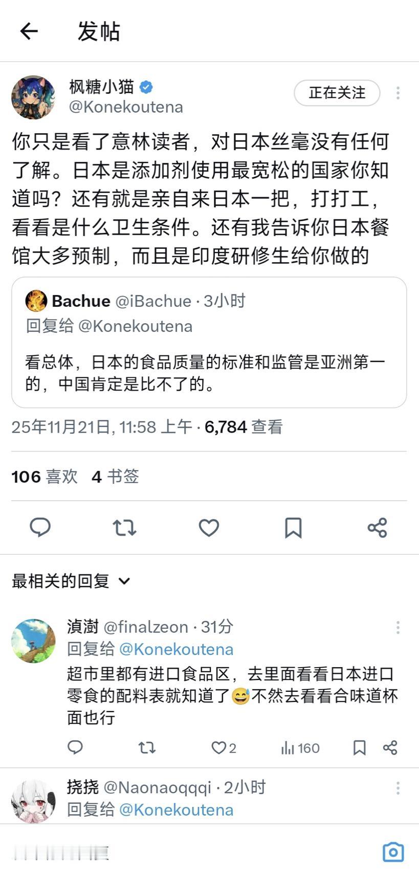 有在日本的网友发文表示:有些人觉得日本的食品质量标准和监管比较好,是看意林读者多了,而对日本丝毫没有任何了解,日本是添加剂使用最宽松的国家,如果你亲自去日本看看,打打工,你就会知道这里的卫生条件如何,日本餐馆里的饭菜大多是预制的,而且这些预制菜还是在日本研学的印度人给你做的。