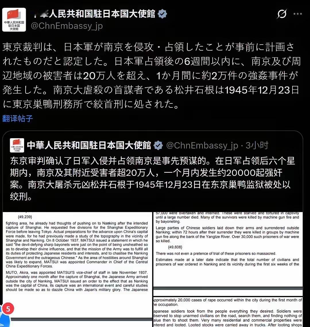 刚刚,上强度,中国驻日大使馆,发了一条推文!警示日本极右翼分子,日本军国主义恶名昭著,血债累累!提醒日本国民,这笔账是要清算的,不要跟着极右翼分子殉葬!昭示世界人民,人性不容践踏,正义需要弘扬,国际秩序需要世界各国共同维护。 有网友说:这不光是大使的声音,这是十四亿中国人民的声音!是三千五百万亡灵的声音! 历史需要多宣传,特别是向日本、美国、东南亚国家宣传 应采取实际行动,在钓鱼岛上建中国标志物,驻军。 对日寇在中国犯下的滔天大罪要利用视频图像数据等各种途径方式全面系统持续不间断的向全世界人民传播公布,让全世界人民斗看清本子的邪恶狠毒丧失天良人性恶本质! 解除对日本的公民免签政策,禁止向日本出口100%的稀土,如果日本胆敢发展核武器,那就是日本灭亡的那一天 大家怎么看呢?