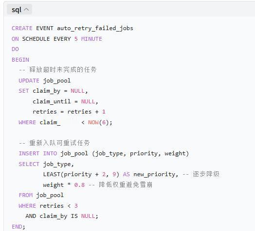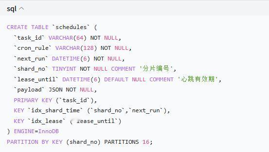 MySQL十亿级任务调度实战:分片锁与智能负载破解卡死重复难题 MySQL任务双雄:分片调度+智能负载实战 用这招让你家系统任务不再卡死和重复 MySQL十亿级任务调度:从雪崩到丝滑秘籍 手把手教你用MySQL搞定k8s级任务编排 在当今复杂的分布式系统环境中,任务调度如同精密时钟的齿轮,有条不紊地推动着各项业务流程的运转。从电商平台的促销活动定时推送,到金融系统的定期清算任务,任务调度的稳定性与效率至关重要。 然而,不少开发者和运维人员在搭建任务调度系统时,常常遭遇任务重复执行、调度卡死、worker 负载不均等棘手问题。今天,我们就深入剖析如何借助 MySQL 的调度中心库task_scheduler和 任务池库job_pool,打造一套高可靠的任务系统,彻底攻克这些难题。 任务调度困境剖析:问题出在哪? 由于服务器的时钟可能存在细微差异,再加上像闰秒这样特殊情况的影响,很容易导致任务执行时间出现偏差。在任务池的管理中,任务饥饿现象时有发生。高优先级任务不断抢占资源,导致普通任务长时间得不到执行机会。 节点过载也是一个大问题,部分执行节点可能因为分配的任务过多,超出其处理能力,导致节点崩溃或任务处理效率大幅下降。 此外,任务状态不一致会给系统管理带来混乱,不同节点对任务状态的记录存在差异,使得无法准确掌握任务的执行进度。 task_scheduler 与 job_pool:双库协同作战 核心功能解析:分工明确,协同高效 task_scheduler(调度库)主要负责定时触发任务,它如同系统的 “定时器”,依据设定的规则精确掌控任务的启动时机。 针对调度库面临的时间漂移、任务雪崩和错过执行等问题,采用分片时钟和心跳锚点的策略。将调度任务进行分片处理,每个分片独立管理,减少任务集中触发带来的压力。 task_scheduler 实战:精准调度的实现。调度主表设计:分片与心跳的结合 在这个调度主表的设计中,通过shard_no字段对任务进行分片,将大量任务分散到 16 个分片中,减轻单个节点的调度压力。 next_run字段明确记录了任务的下次执行时间,lease_until字段作为心跳锚点,用于标记任务的心跳有效期。idx_shard_time和idx_lease索引的建立,提高了根据分片编号、执行时间和心跳有效期进行查询的效率。 心跳更新机制:确保任务时效性 心跳更新存储过程通过传入任务 ID 列表和心跳持续时间,更新相应任务的心跳有效期。 定期执行这个存储过程,就像给任务打强心针,确保任务在规定时间内保持活跃状态,避免因长时间未被处理而失效。 分片调度查询:避免任务重复执行 在分片调度查询中,FOR UPDATE SKIP LOCKED是关键。它确保当前节点在获取任务时,跳过那些已经被其他节点锁定的任务,避免同一任务被多个节点重复领取和执行。 假设没有这个锁机制,可能会出现同一批优惠券发放任务被多个节点同时执行,导致优惠券发放数量失控。 两库联动:跨节点任务编排与管理。任务编排视图创建:统一任务视角。 通过创建任务编排视图,将调度库和任务库的数据进行关联。从这个视图中,可以清晰地看到每个任务的调度信息,如任务 ID、下次执行时间。 任务详情以及执行状态,为跨节点任务编排提供了统一的视角,方便进行任务的整体管理和监控。 失败任务自动重试机制:保障任务完整性 总结 通过对 task_scheduler 和 job_pool 的深入探讨以及实际案例的分析,我们可以总结出打造高可靠任务系统的关键要点: 精确调度:利用分片时钟和心跳锚点,解决调度中的时间漂移、任务雪崩和错过执行问题,确保任务按时、准确地触发。 合理分配任务:采用抢占式锁和权重分配策略,避免任务饥饿和节点过载,实现任务在不同执行节点间的均衡分配。 完善任务编排与管理:通过创建任务编排视图和失败任务自动重试机制,实现跨节点任务的统一管理和任务执行的完整性保障。 避免常见问题:在设计和实现任务调度系统时,要注意锁机制的正确使用、权重计算的精度、时区差异的处理以及任务分片的合理性,防止出现全表锁死、精度丢失、时间偏差和分片不均等问题。 希望通过本文的分享,能够帮助大家打造出更加稳定、高效的任务调度系统。 如果你在任务调度系统建设过程中遇到了其他问题,或者有更好的实践经验,欢迎在留言区分享交流!