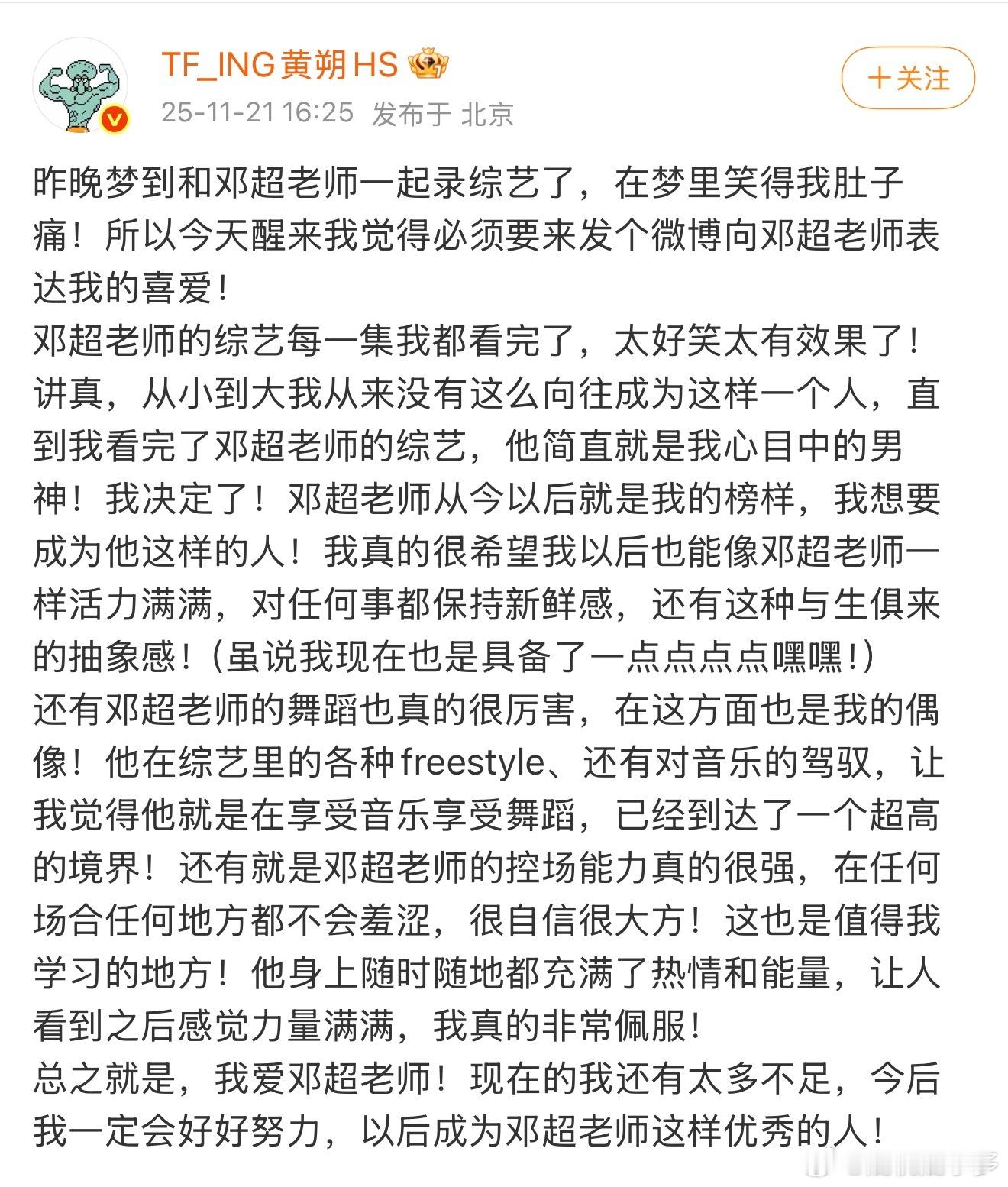 woc,黄朔居然是邓超的梦男,发文说昨晚梦到和邓超老师一起录综艺了,说邓超的每一集综艺都会看,跳舞也很好,总而言之言而总之就是他🩷邓超老师