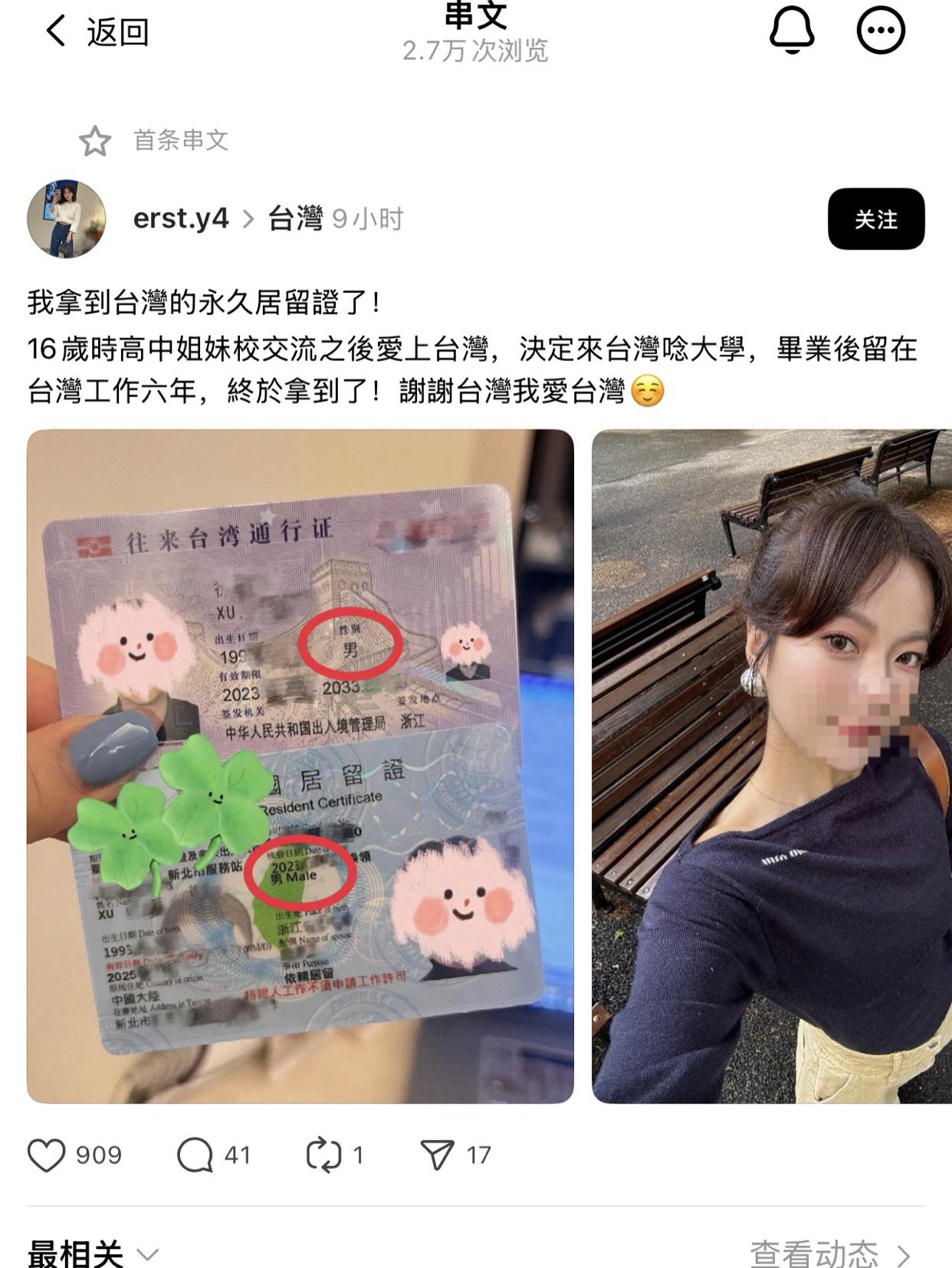 有一位在台湾工作的大陆浙江男子兴奋的发文表示:她终于拿到台湾的永久居留证了!她16岁时与高中的姐妹在校交流之后就爱上了台湾,并因此决定去台湾念大学,毕业后选择留在台湾工作六年,现在终于拿到了!谢谢台湾!她爱台湾!