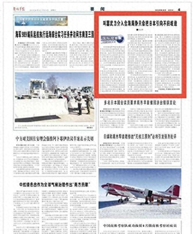 涉台挑衅自寻绝路!日本右翼冒险,中方迎头痛击加经济反制 日本政客公然将台湾问题挂在嘴边,还扬言要武力介入,这已经不是简单的言论越界。 解放军报直接亮明态度,再敢迈出危险一步,整个日本都可能沦为战场。 本来中日关系就需要谨慎维护,偏偏有人非要往火坑里跳。 这波操作不光让国际社会聚焦,更把日本自己推到了风口浪尖,后续的连锁反应怕是始作俑者都没算明白。 高市早苗作为日本首相,公开妄议台海问题确实打破了之前的惯例。 她不光嘴上说得硬,还计划明年年底修订安保三文件,目的很明确,就是要增加军费搞扩军。 这些年日本的防卫预算一路上涨,武器出口限制也越放越宽,明眼人都能看出其军事扩张的心思。 日本国内也不是没人清醒,前首相石破茂和野田佳彦就明确表示,台海问题太敏感,不该公开表态把日本绑上战车。 立宪民主党官员在电视节目里直接批评高市早苗对安保法律理解不深,对台湾问题认知有欠缺。 就连自民党内部也有人反思,觉得不该说这种没分寸的话。 面对这种挑衅,中方的回应又快又硬。 外交部、国防部、国台办还有驻日使馆,短短几天内密集发声,明确警告敢介入就迎头痛击。 光说不够,海军编队穿越大隅海峡,黄海实弹射击训练,用实际行动证明不是吓唬人。 解放军的常态化演训,既针对台独分裂势力,也给外部干涉者敲了警钟。 日本的冒险举动也让周边国家提高了警惕,中俄朝在涉台涉日问题上多次协调立场。 三国在地区安全问题上的态度逐渐一致,如果日本真要借台海问题搞扩张,恐怕要面临集体反制。 这种战略层面的联动,不是凭空猜测,而是基于共同维护地区和平的诉求。 挑衅带来的后果很快就显现了。 中方多个部门接连发布预警,提醒民众暂时别去日本,留学也要谨慎规划。 这不是什么经济制裁,而是因为在日中国公民遭遇的违法犯罪案件越来越多,安全得不到保障。 日本媒体之所以慌了,是因为中国游客对他们的旅游业太重要,真要是没人去,损失可不小。 无奈之下,日本想借G20峰会和中方沟通,但直到现在也没个准信。 东京街头有上百名民众自发集会,高喊让高市早苗辞职道歉的口号。 日本学者也联名呼吁,认为她的言论是历史修正主义抬头,最终会损害日本自身的安全和经济。 台湾是中国的一部分,这是国际社会公认的事实,任何外部势力都无权干涉。 日本右翼的挑衅,既违背历史潮流,也不符合日本自身利益,内外承压都是自找的。 中方的每一步回应,都是在维护国家主权和领土完整,没有丝毫妥协的余地。 中日关系的发展需要双方珍惜,日本该认清形势,停止错误言行。 中国维护国家统一的决心不会动摇,不管是谁,只要敢伸手干涉台海问题,必将付出应有的代价。 玩火者必自焚,这个道理希望日本某些势力能早点明白。