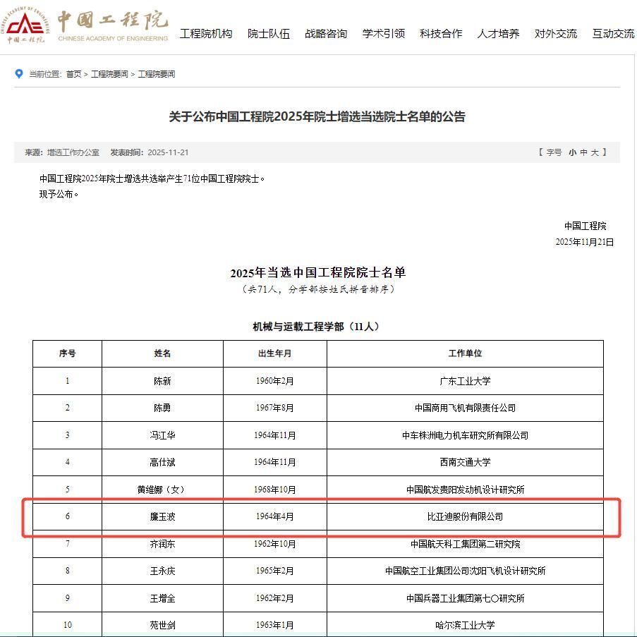 就在今天,中国工程院公布了2025年院士增选结果,比亚迪集团首席科学家、汽车总工程师、汽车工程研究院院长廉玉波当选中国工程院院士。据悉,廉玉波长期致力于新能源汽车关键系统及整车研发工作,并取得一系列核心技术突破。而现在以技立身荣膺院士,也算是实至名归,毕竟这份荣誉含金量真的太高了,并不是随便谁都能拿的。这不仅是对其个人成就的最高认可,也再次证明了比亚迪“技术为王,创新为本”的路子走对了、走稳了。正因为有了这样的技术领军人物,我们才能在新能源赛道上持续领跑,让中国智造在世界舞台上站得更稳、走得更远。