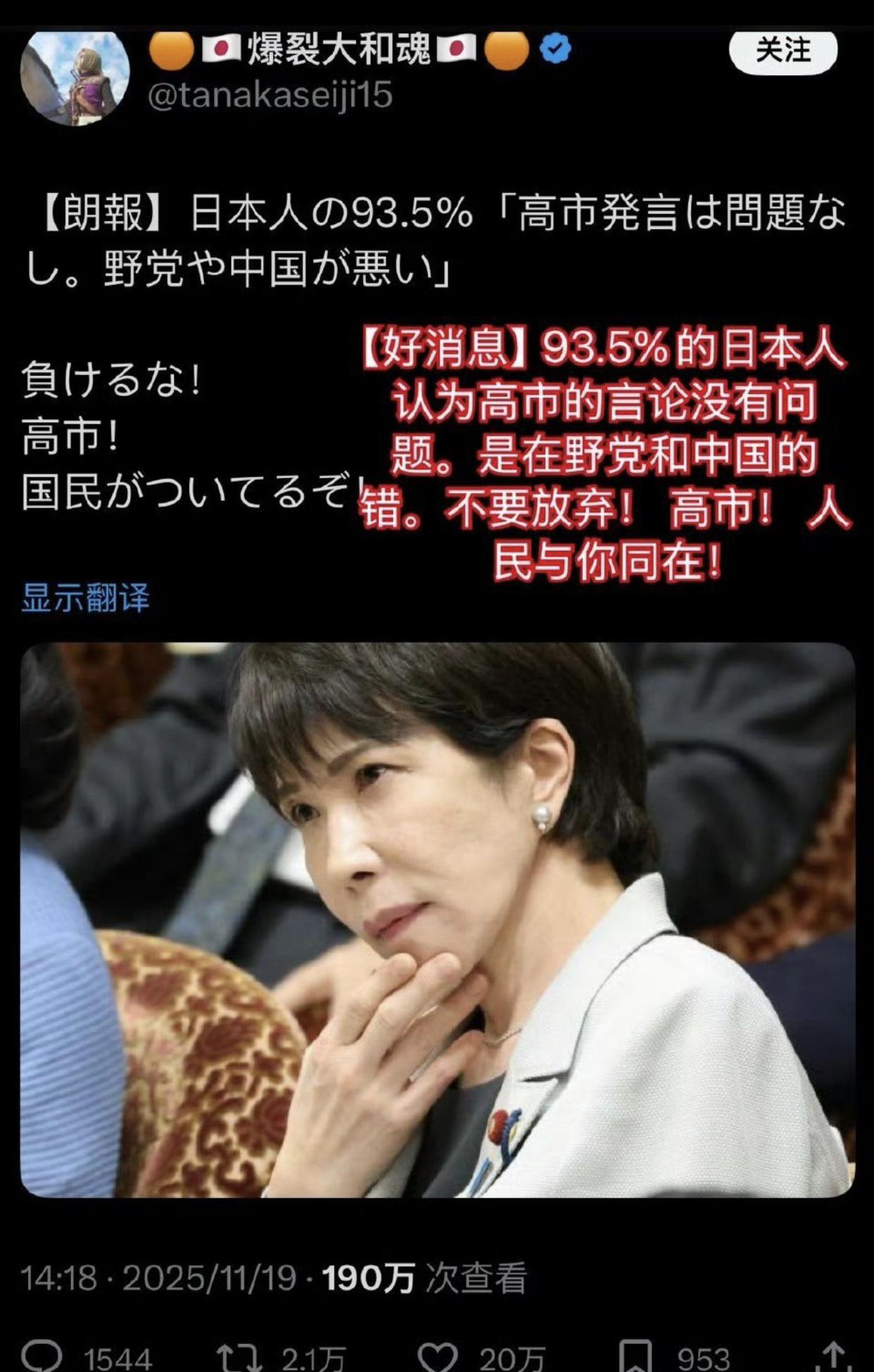 有日本人发文表示:好消息,在日本,有93.5%的日本人认为高市早苗的涉台言论没有问题,他们鼓励高市早苗不要放弃,他们与她同在,他们觉得这一切都是日本在野党和中国的错。