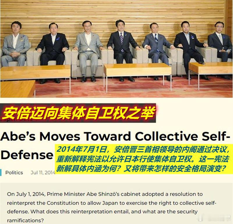 图1:在甲午海战开战120周年的2014年在,解放军为开启的“大军改”唯一衡量标准,全军展开了“战斗力标准大讨论”;图2:同年日首相安倍晋三重新解释了行使集体自卫权的权利;图3:2015年日本确立使用武力的法律框架包括有“存亡危机事态”;图4:同年解放军启动“大军改”;图5:十年后日高市早苗口吐狂言将“存亡危机事态”与解放军“武统”挂钩;图6:经历了十年“大军改”打磨的解放军给予强硬回怼