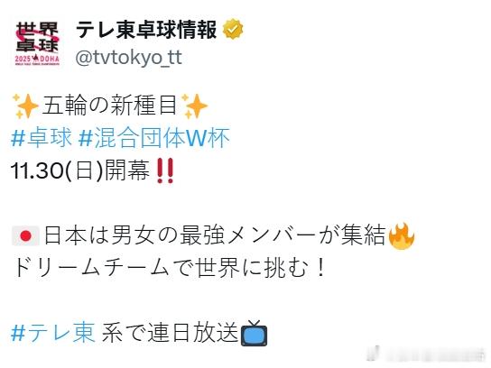 “✨新增奥运项目✨卓球 混合団体世界杯11月30日星期日开幕‼️🇯🇵日本将派出最强的男女队员🔥与梦之队一起征服世界!”cr:东电