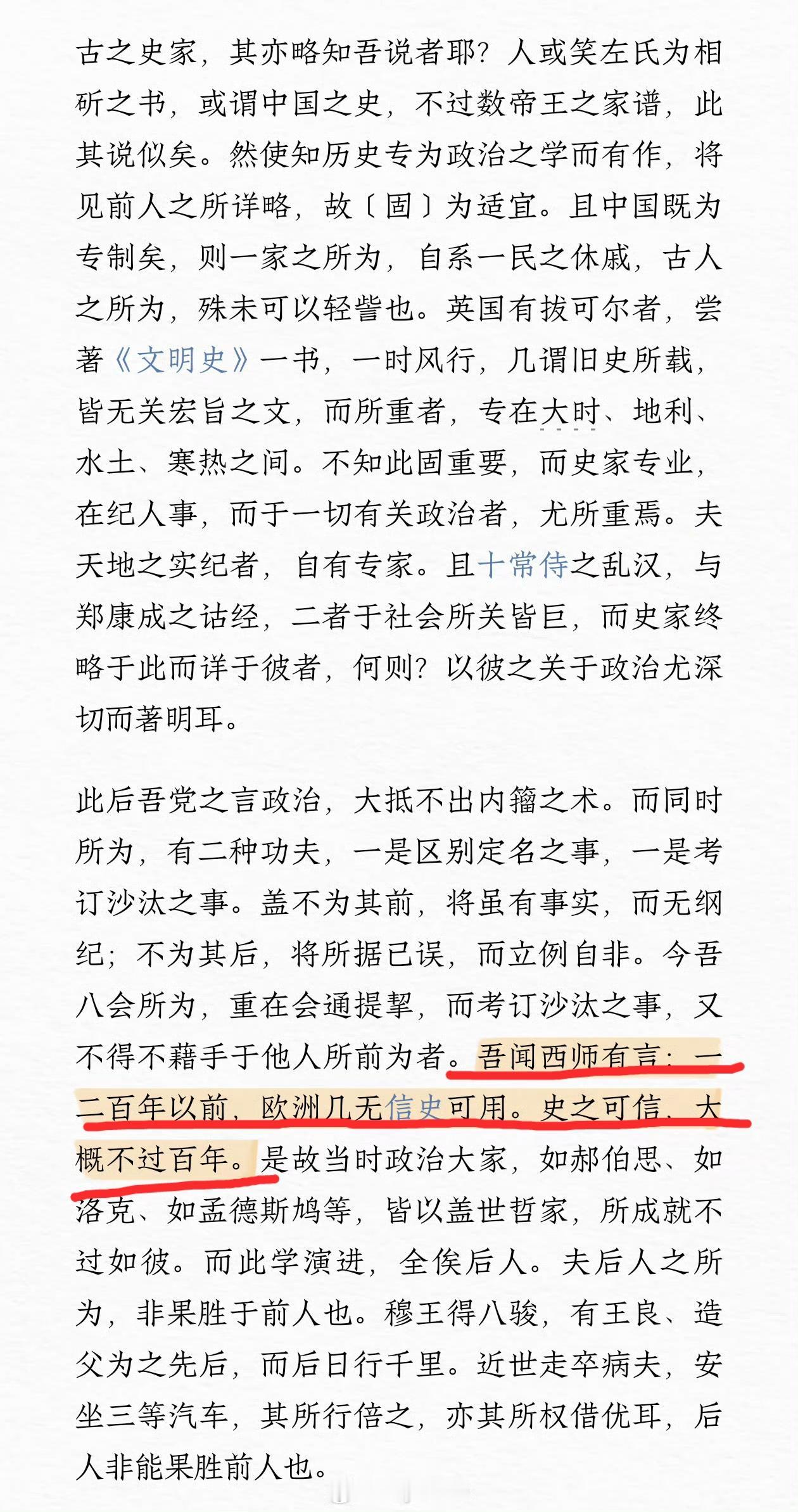 关于欧洲欧洲真实的历史,大名鼎鼎的严复早就在自己的书信手稿里,泄露了天机。他写道:“吾闻西师有言:一二百年以前,欧洲几无信史可用。史之可信,大概不过百年。” 严复 1877 年前往英国留学,他的老师说欧洲可信的历史不过百年,也就意味着欧洲一直1800 年左右才开始有真正记录历史的习惯。