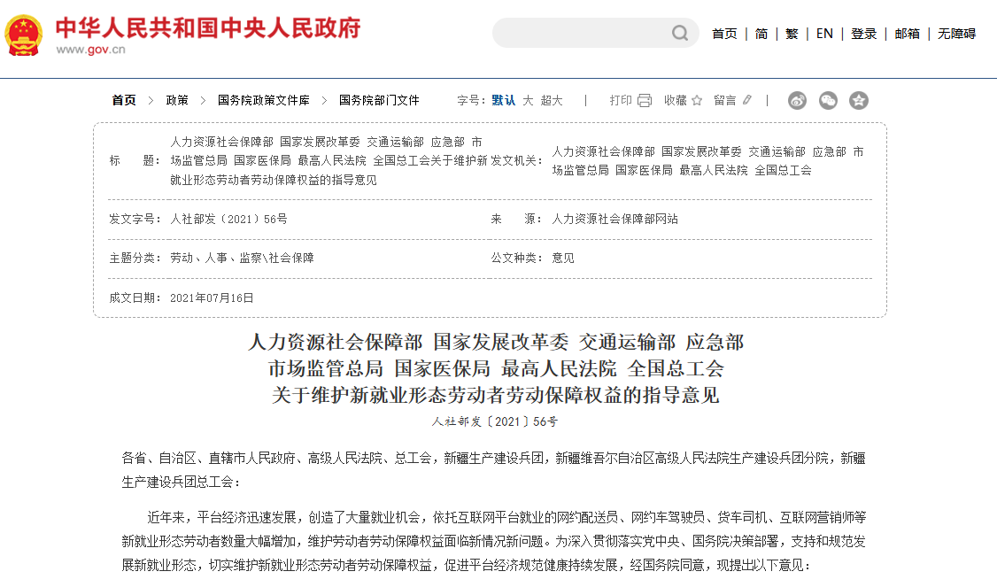 这次会议并非孤立事件,而是一系列政策行动的延续和升级。早在2021年,人社部等八部门就联合发布了被称为“56号文”的《关于维护新就业形态劳动者劳动保障权益的指导意见》。