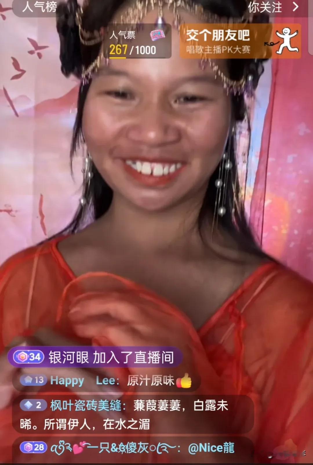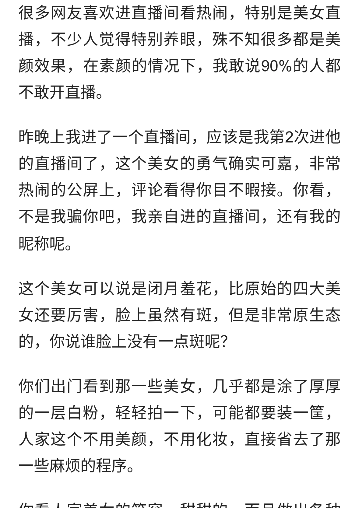 没开美颜敢直播,美女你是第一个,都说网络美女多, 谁知美颜来衬托? 你见过直播间的素颜美女吗?真正的素颜美女值得青睐。 昨晚上我在直播间亲自看到了这一幕,太实在了。 别的直播间你肯定看的都是非常漂亮的美女,对吧? 告诉你们那些都是假象,美颜加化妆绝对是属于欺骗。 这位美女没有化妆,没有开美颜,让大家知道网络太假。 美女的公屏上一片祥和热闹,这种颜值开直播还没人喷她。 而且还有不少人给她刷人气票,那些美颜下的反而没有。 网友们的热情,给了素颜美女勇气,也讽刺了那一些美颜。 不少网友说美颜下的直播确实好看,但不真实。 你们也是第1次看这种素颜吧?我全程录屏也是为了分享给大家。