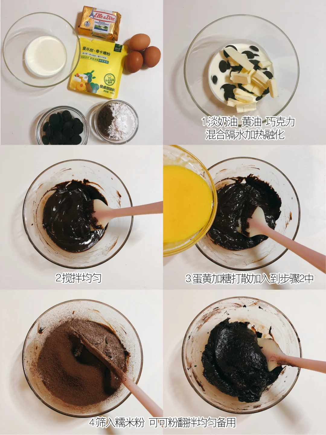 ❷蛋黄加入糖粉打散,加入到步骤1中,搅拌均匀。筛入糯米粉、可可粉、盐翻拌均匀备用。