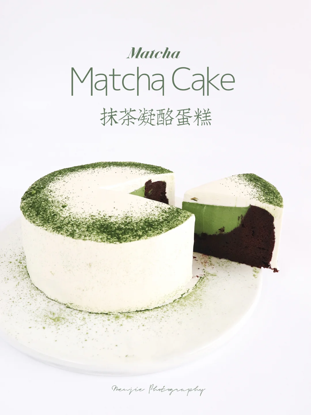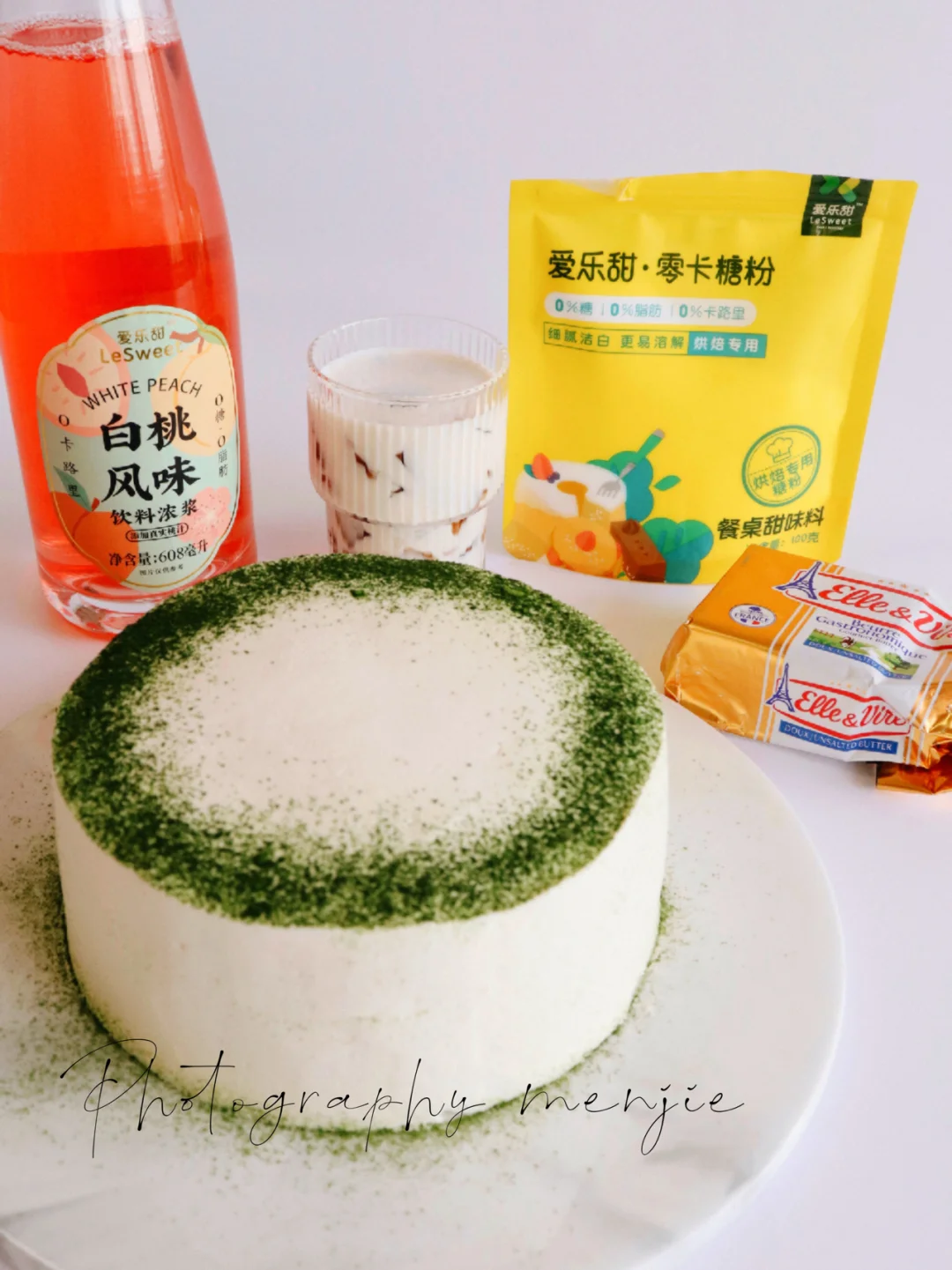 ❽顶层奶油:淡奶油加入糖粉打发,将凝固好的蛋糕抹面,在蛋糕上撒上一圈抹茶粉即可。