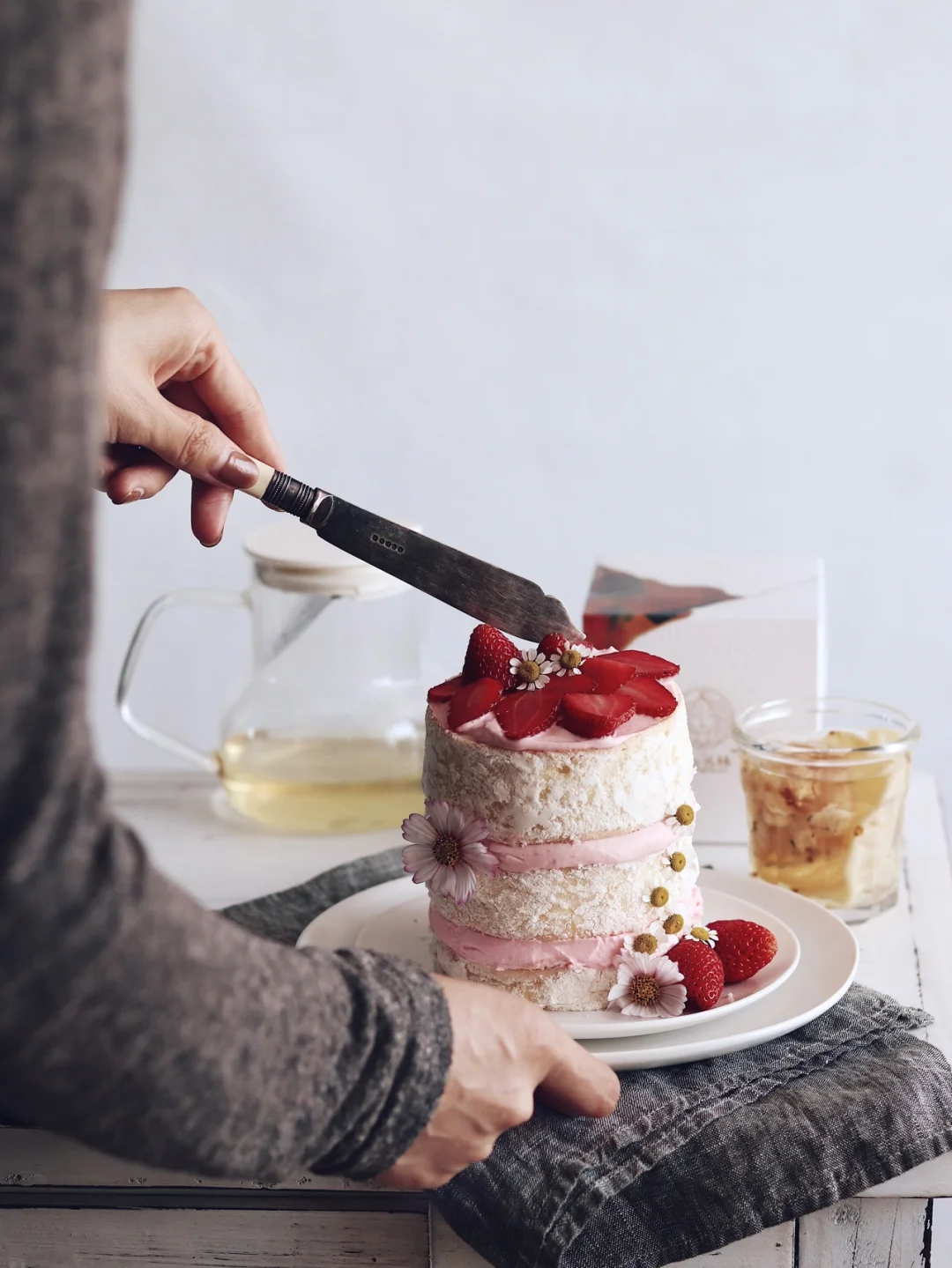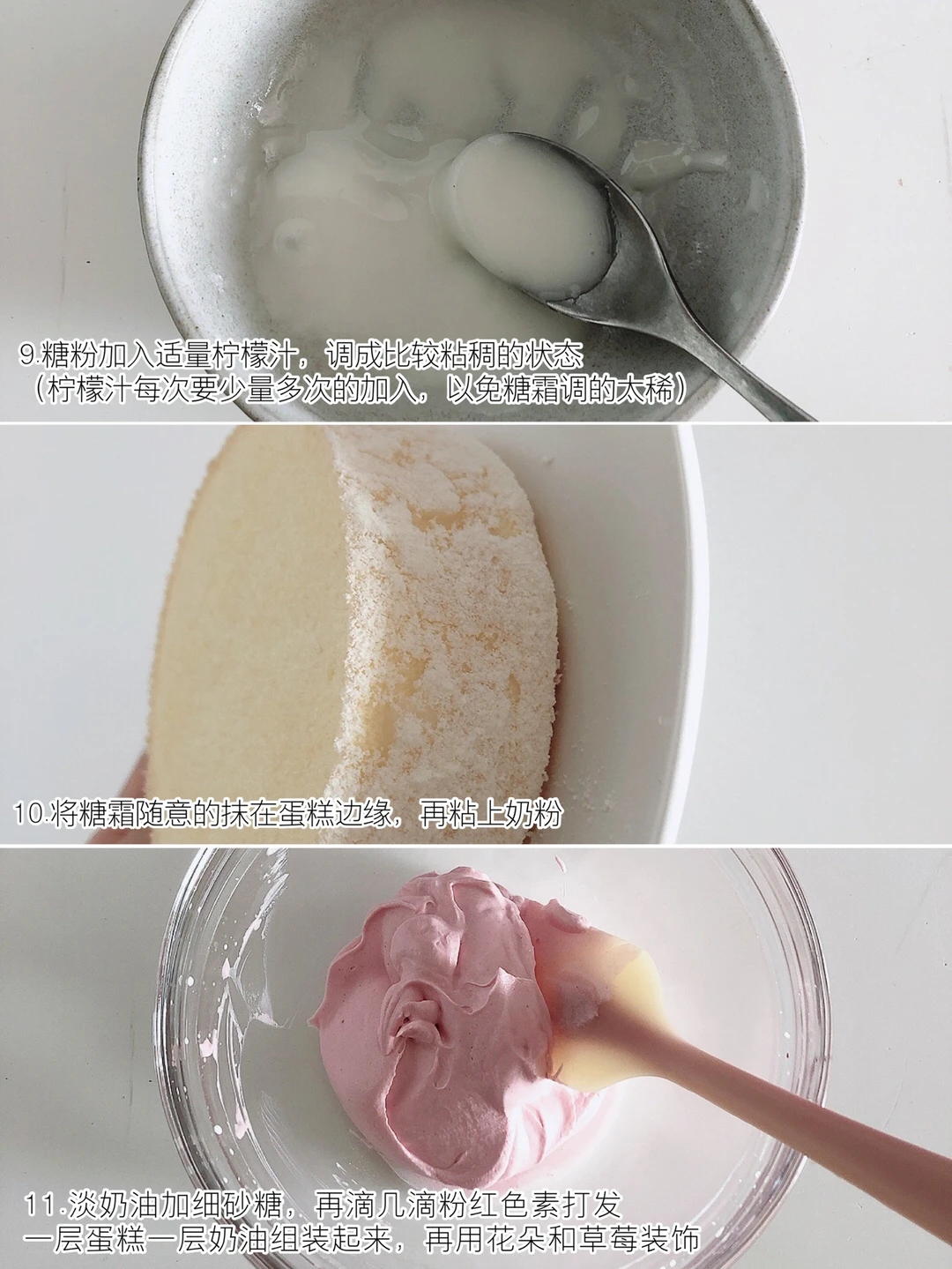 ❼淡奶油加糖,滴入色素打发,一层蛋糕一层奶油组装起来,用花朵和草莓装饰即可。