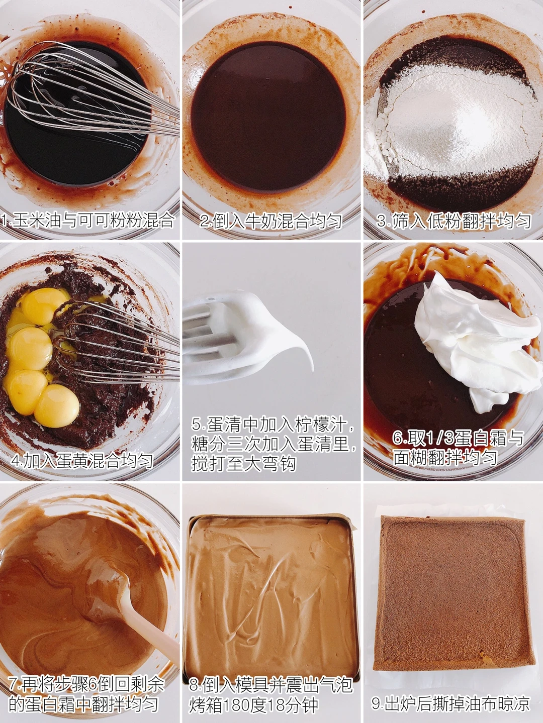 可可粉 15g|玉米油 50g|牛奶 50g|低筋面粉 50g|全蛋 5个|细砂糖 55g|柠檬汁 适量