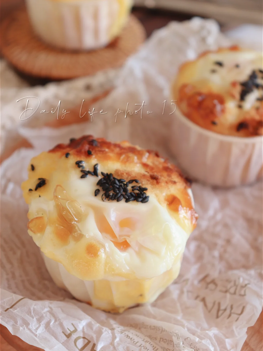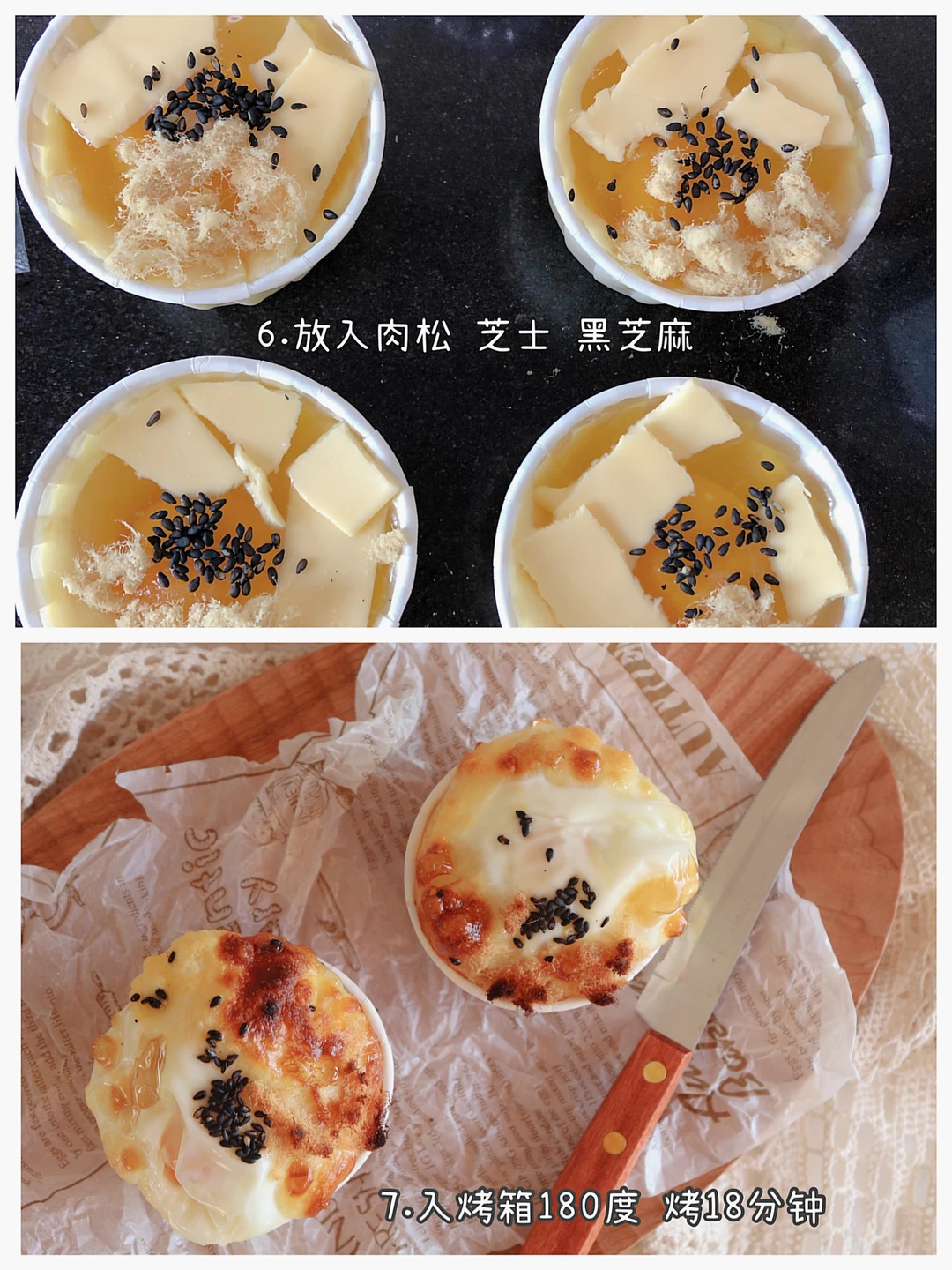 ❸倒入纸杯五分满,打入一颗鸡蛋,放上芝士片,肉松,黑芝麻。