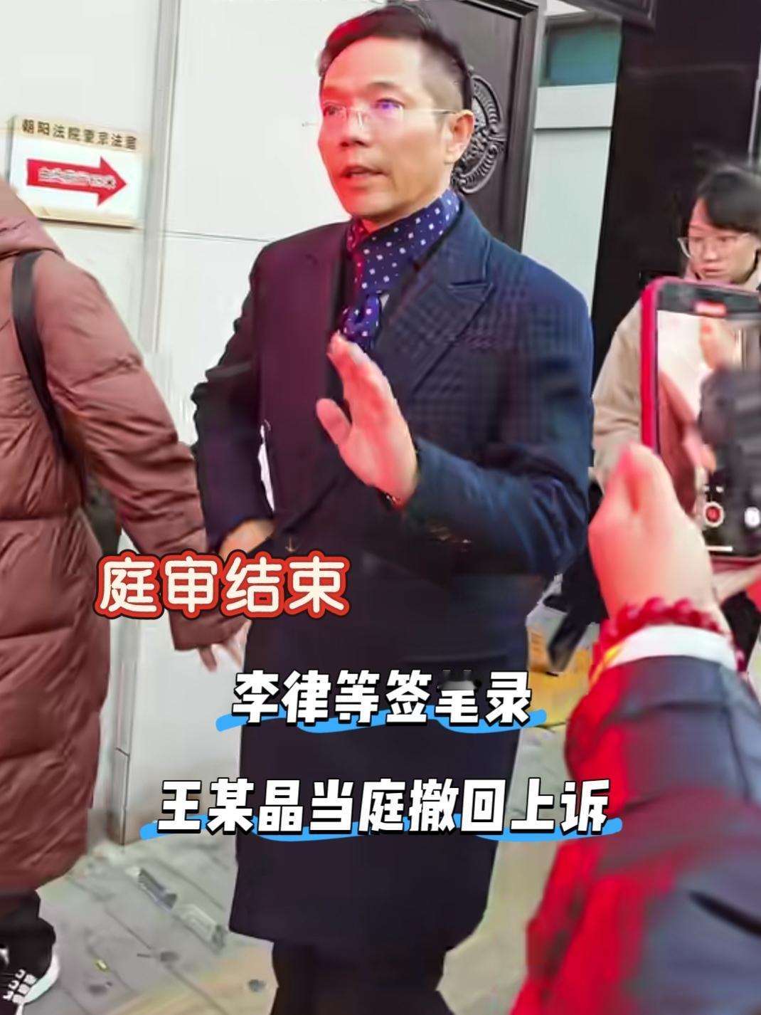 昨天下午16:45分,李圣律师走出法庭,他告诉粉丝,王某当庭撤诉,庭审立即终止。