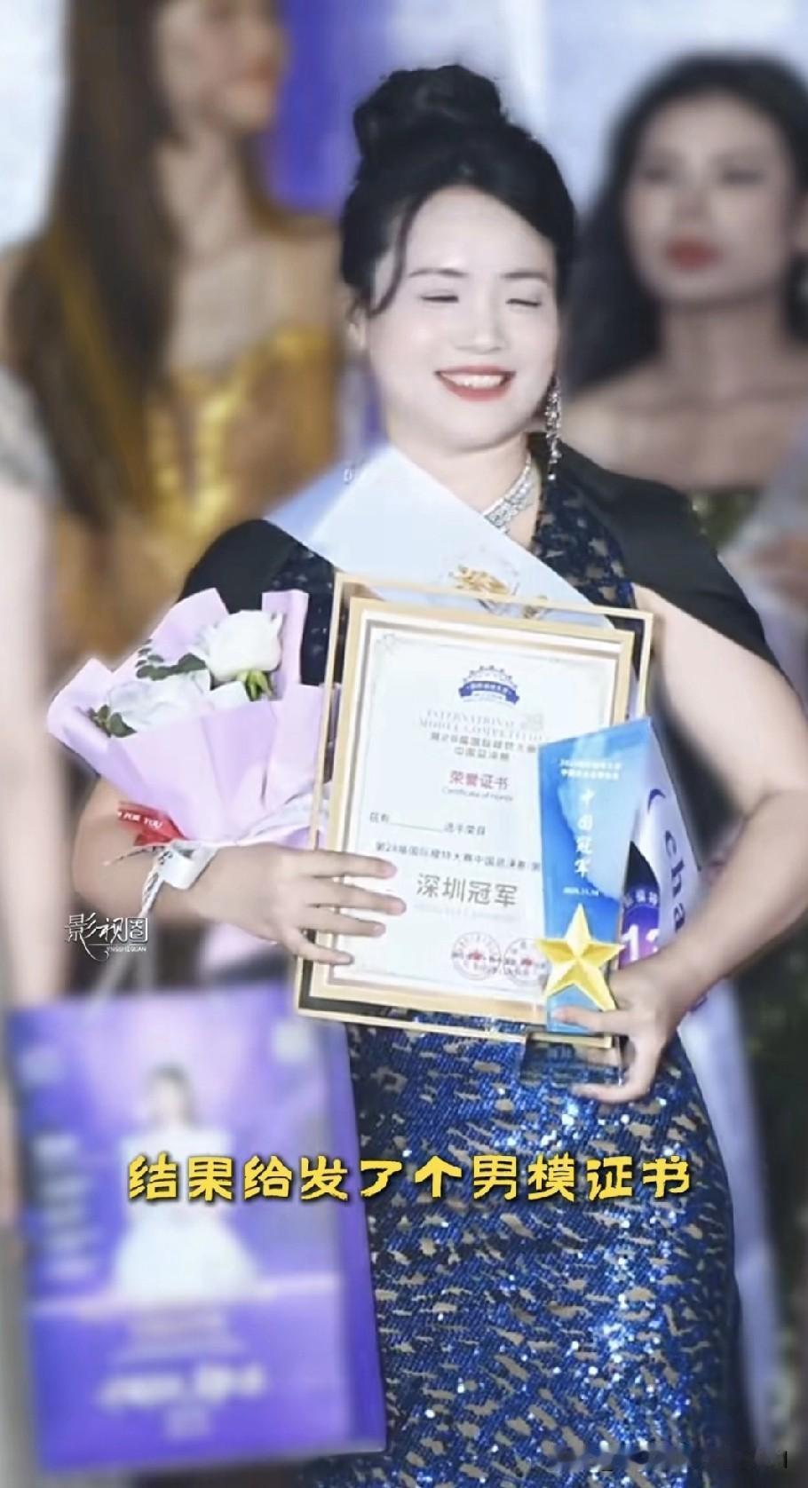深圳模特冠军来了,深圳这个冠军起码40岁大嫂级别了。和广东的那个60岁太太冠军如出一辙。这选美归谁管呀,出了这么多笑料,还在继续。就感觉评委和大赛组织者和我们不在一个星球。 看看深圳女模特冠军是男模组冠军,都跨性别了。 这届评委要凭一己之力,改变全国人民的审美观念- 浓眉大眼、皓月脸、骨骼壮硕为后世之美!不要叫做选美比赛,干脆叫腐败大赛好了。这样的选美比赛,有意义吗?真的让人感到耻辱。这选美活动有问题,不要只看表面,当笑料,要看背后的操作者,是出于什么目的,这和毒教材有异功同曲之妙,多省都在进行,没有一个站出来说明情况,没有一个看出问题来吗?看了最近多地的选美冠军,实际上这是一个导向。