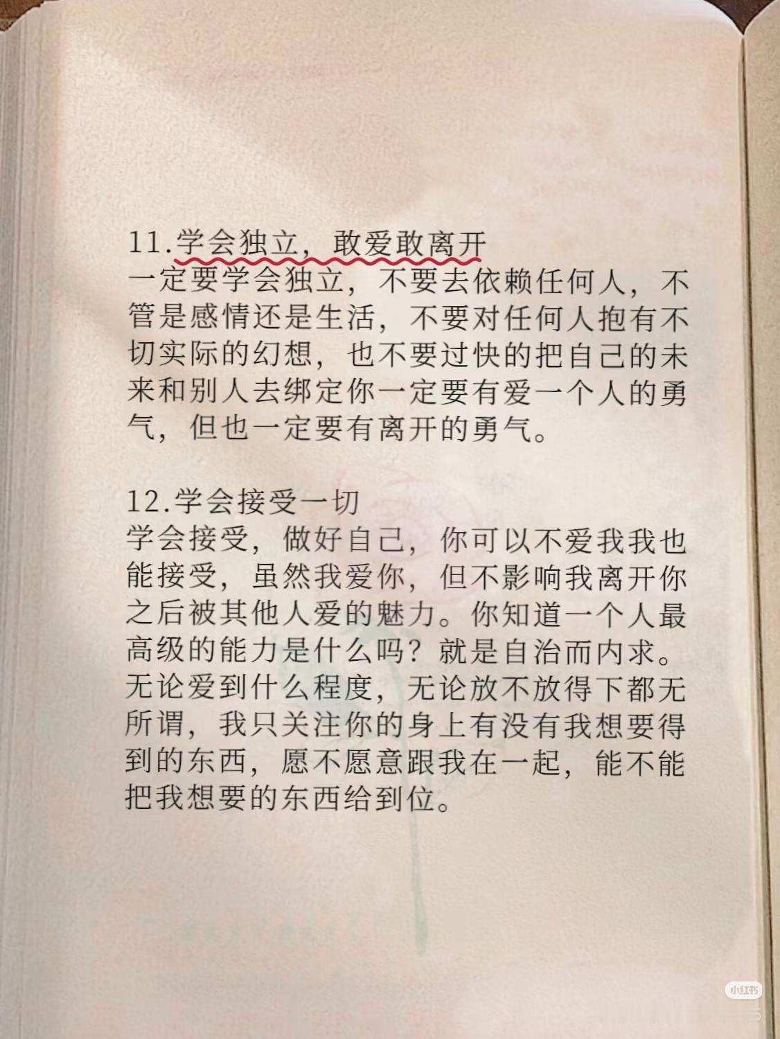 今天在网上看到这几张图,图上写的感觉挺现实,但女人做到这几点很难! 但女人最好的控制就是不控制!女人,关注点永远都是自己身上!你一定要记住你是一个独立的个体,不属于任何人!简单。开心,自由,洒脱,健康的做自己,爱自己才是王道