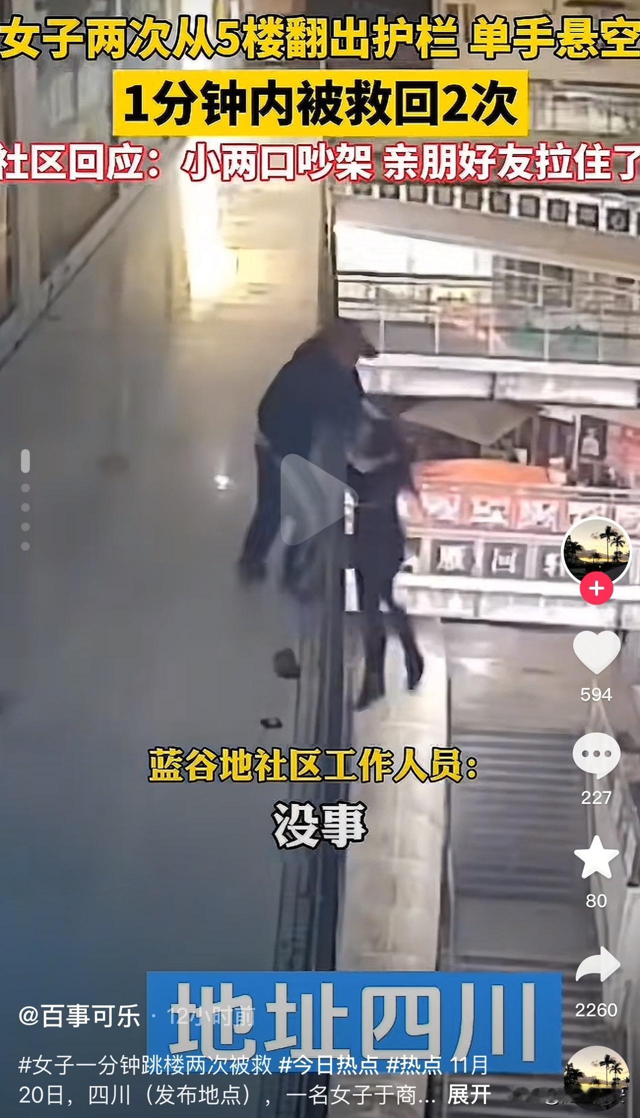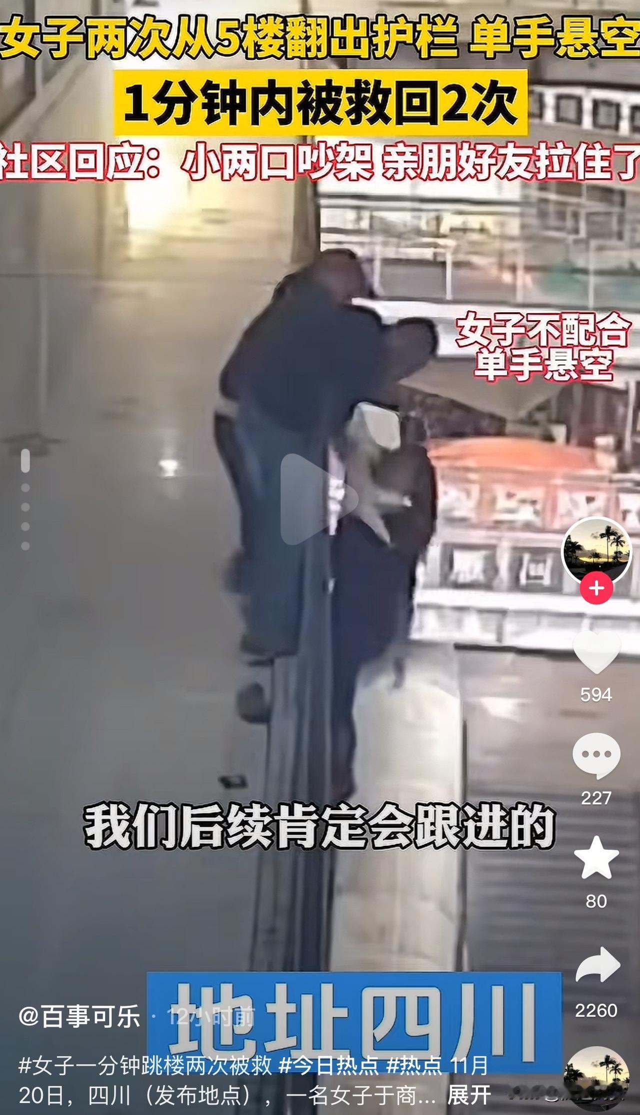太危险了!四川,一女子走到5楼的护栏,突然纵身一跃,准备从护栏跨越跳下去轻生,被旁边的一黑衣男子看到,赶紧冲过去把她拉回来,不料,她想再次跳下去。 视频里,女子来到护栏边,双手抓住,左脚果断跨过去,整个动作行云流水,不带一丝拖泥带水,没有任何犹豫。 眼看着女子就要往下跳,旁边的黑衣男子赶紧冲过去把她拉下来,随后把她拉到墙边,和另外一男子一起好言相劝。 不料,该女子不听劝,竟又一次又冲到护栏边,果断翻身往下跳,戴帽子的男子紧随其后抓住了她的胳膊,这时,女子整个身体已经悬空。 黑衣男子也赶过来再次救她,他俩想让女子配合一下,好把她拉上来,结果女子再次拒绝配合,直接一只手抓护栏,整个身体摇摇欲坠,稍有不慎就会直接掉下。 最终,该女子被三个男子合力营救下来。 事后,社区工作人员表示当天该女子和她老公吵架了,救她的都是劝架的好朋友,此事还在处理中。 因和老公吵架,就如此决绝的跨越护栏要轻生,但凡男子稍微慢一点,悲剧就发生了。 其实真的没必要想不开,只要活着就没有解决不了的问题,既然连死都不怕,还怕活着吗,所以首先要为自己好好活着! 救人一命胜造七级浮屠,为那几个男子点赞,如果不是他们神速,女子或许就不在了。 生命只有一次,希望不要因冲动就放弃,也希望大家都能好好珍惜!