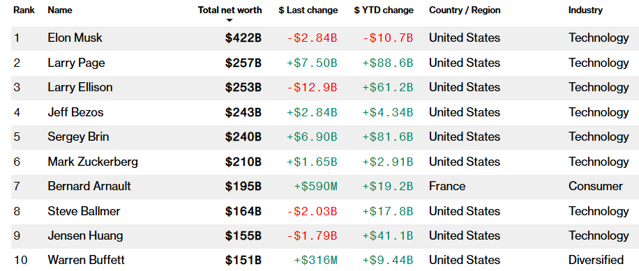 目前,布林也以2399亿美元的净资产身家,在彭博富豪榜单上跻身至第五位。