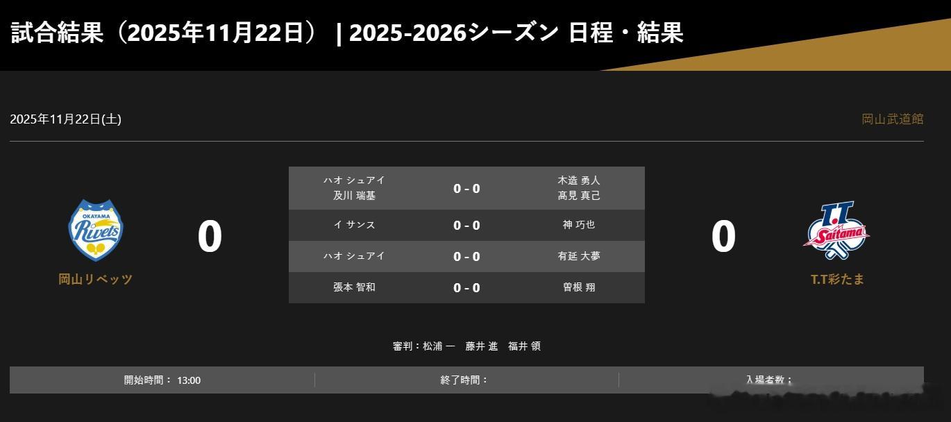251122 北京时间12:00 冈山 Vs. 彩玉第一盘 郝帅/及川瑞基 Vs. 木造勇人/高见真己第二盘 李尚洙 Vs. 神巧也第三盘 郝帅 Vs. 有延大梦第四盘 张本智和 Vs. 曾根翔本场比赛将通过油管T.LEAGUE帐号免费直播。