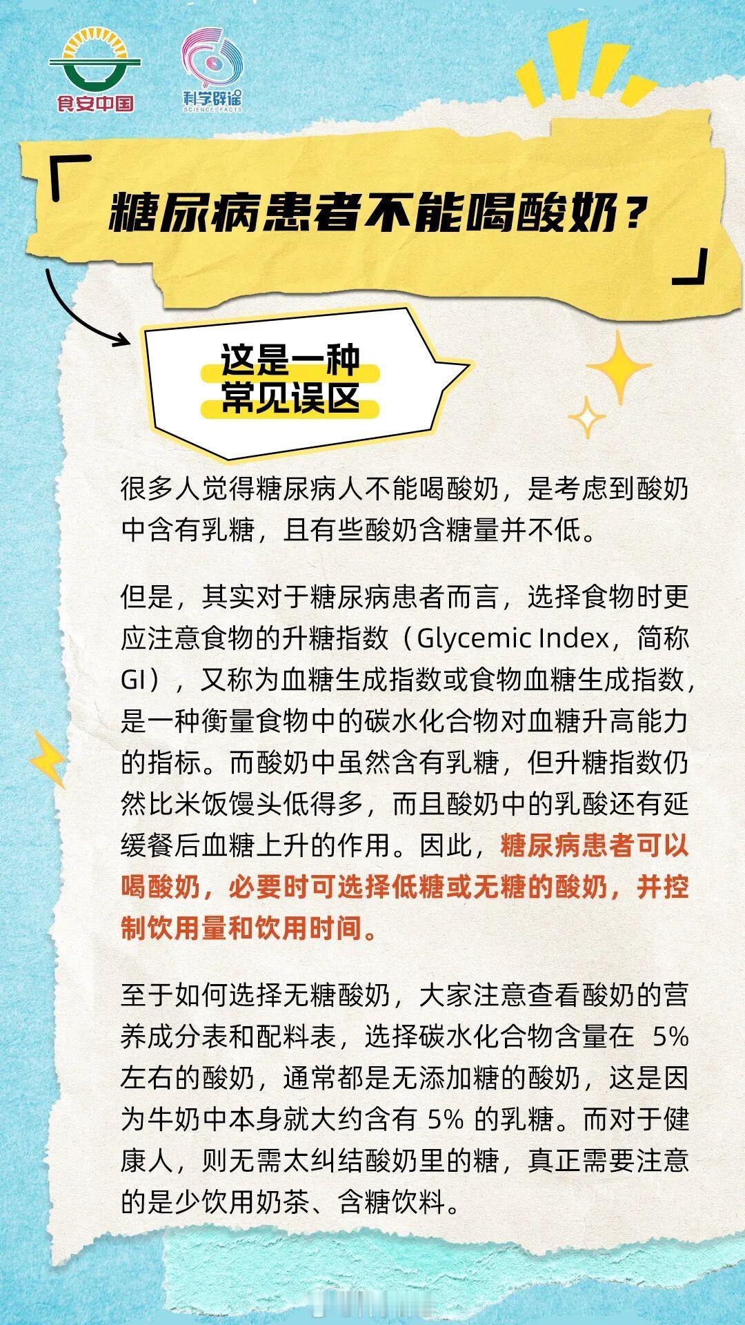【糖尿病患者不能喝酸奶?常见误区】其实对于糖尿病患者而言,选择食物时更应注意食物的升糖指数(Glycemic Index,简称 GI)。而酸奶中虽然含有乳糖,但升糖指数仍然比米饭馒头低得多,而且酸奶中的乳酸还有延缓餐后血糖上升的作用。因此,糖尿病患者可以喝酸奶,必要时可选择低糖或无糖的酸奶,并控制饮用量和饮用时间。