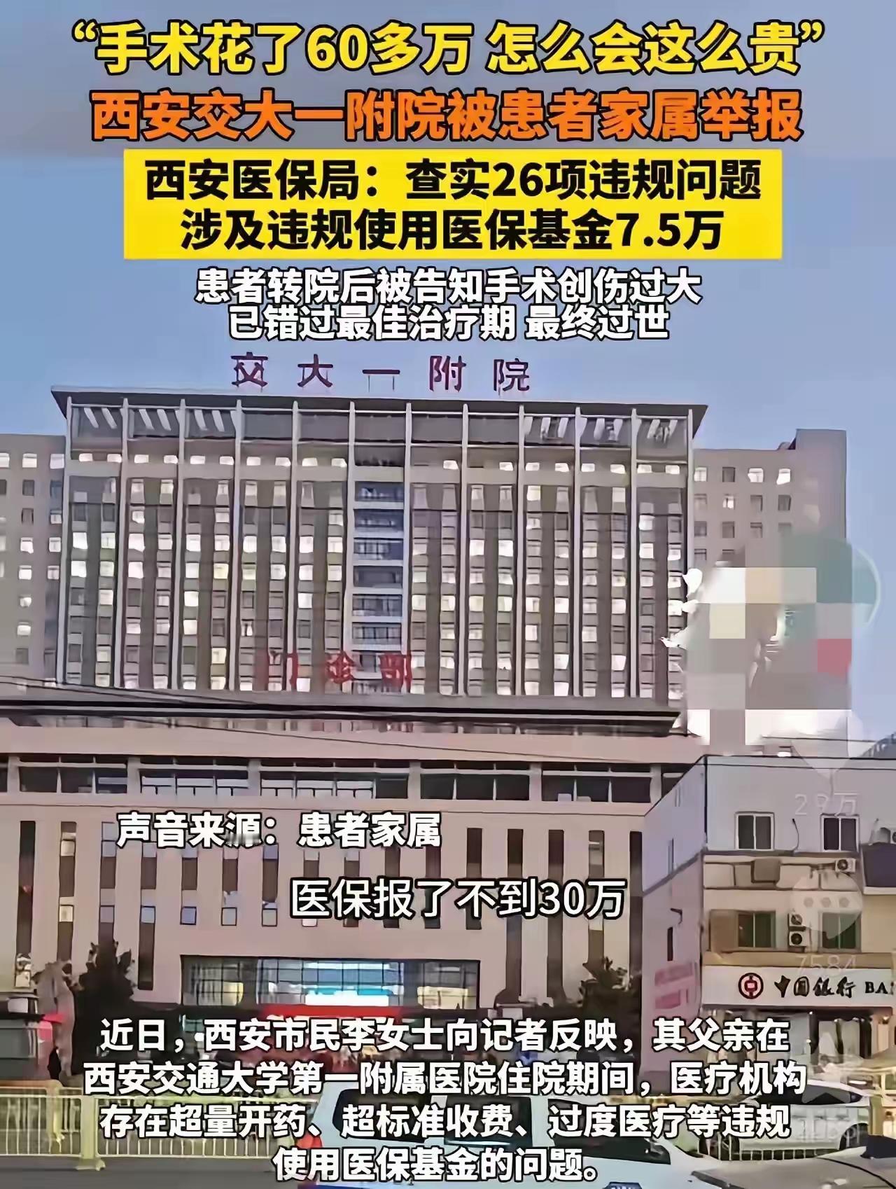 西安交大一附院60万手术费藏猫腻!26项违规套取医保7.5万,信任崩塌只在一瞬间 60万手术费背后竟藏着违规操作!西安交大一附院给患者做手术,高昂费用让家属起了疑心,一举报就查出大问题。 经西安医保局核查,这家医院存在26项违规行为,涉嫌违规使用医保基金7.5万元。要知道,医保基金是老百姓的“救命钱”,每一分都该用在刀刃上。医院作为救死扶伤的场所,本该严守行业底线,却借着手术的名义动起歪心思,实在让人寒心。 家属的警惕心戳破了这场猫腻,但网友们不禁疑问,这会是第一次吗?大概率是以往的违规没被发现,才让医院有了恃无恐。几十年建立的医患信任,可能就因为这样一次次的违规操作,一夜之间崩塌。患者把健康甚至生命交给医院,换来的却是对费用的算计,这种行为不仅违背医德,更触碰了行业红线。 医院的公信力从来不是凭空而来,而是靠一次次规范诊疗、诚信收费积累的。医保部门的严查值得点赞,但更需要建立长效监管机制,让违规行为无处遁形。 你觉得该如何杜绝医院违规套保?遇到可疑医疗收费,你会选择忍气吞声还是主动举报?欢迎在评论区聊聊你的看法。