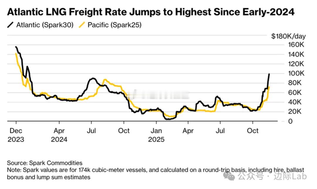 北美液化天然气(LNG)出口量的持续增加,导致可用运输船只供应趋紧,进而推动大西洋航线的LNG现货运价单日跃升19%至每日98,250美元,创下自2024年初以来的最高水平。来源:Bloomberg