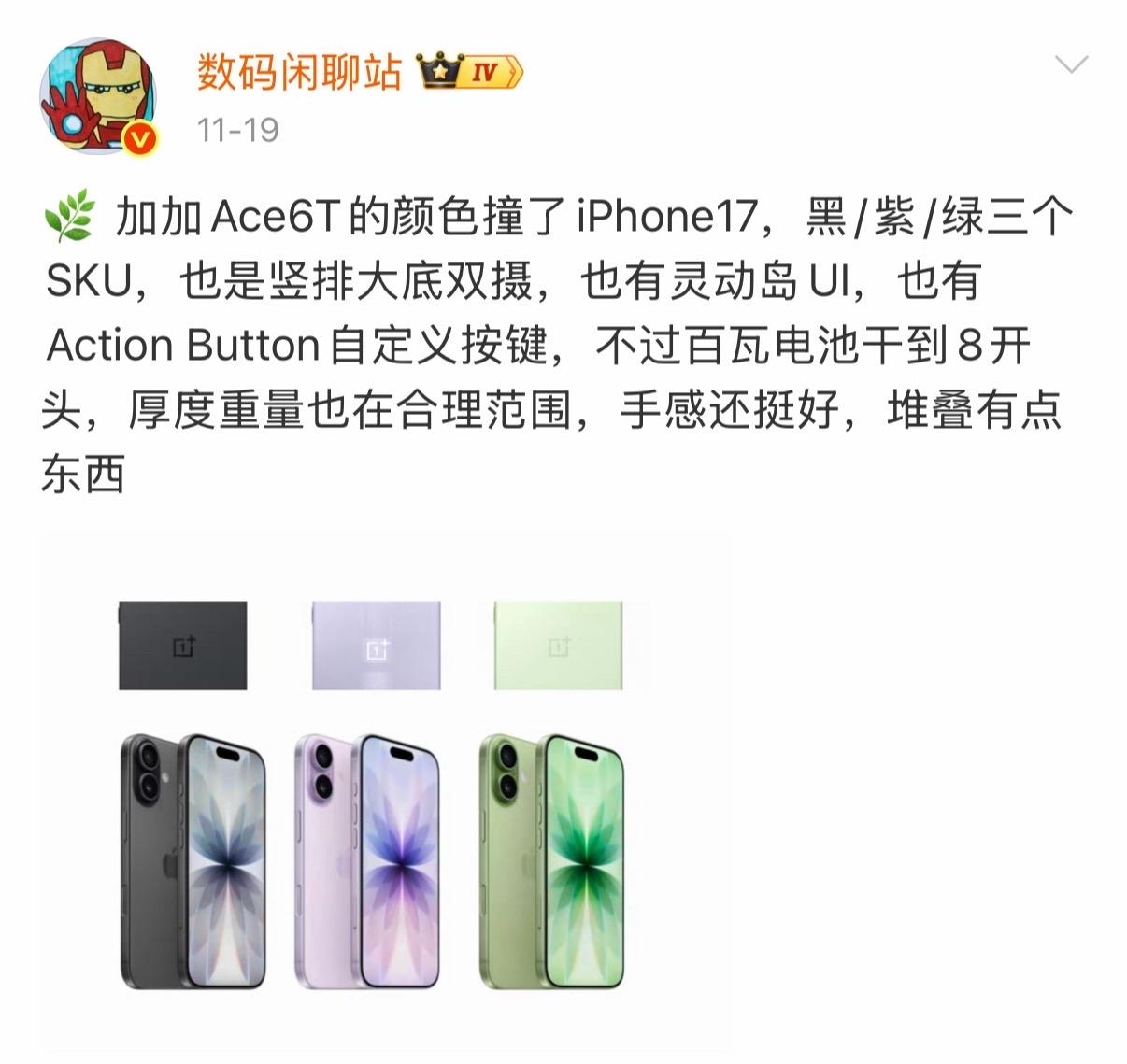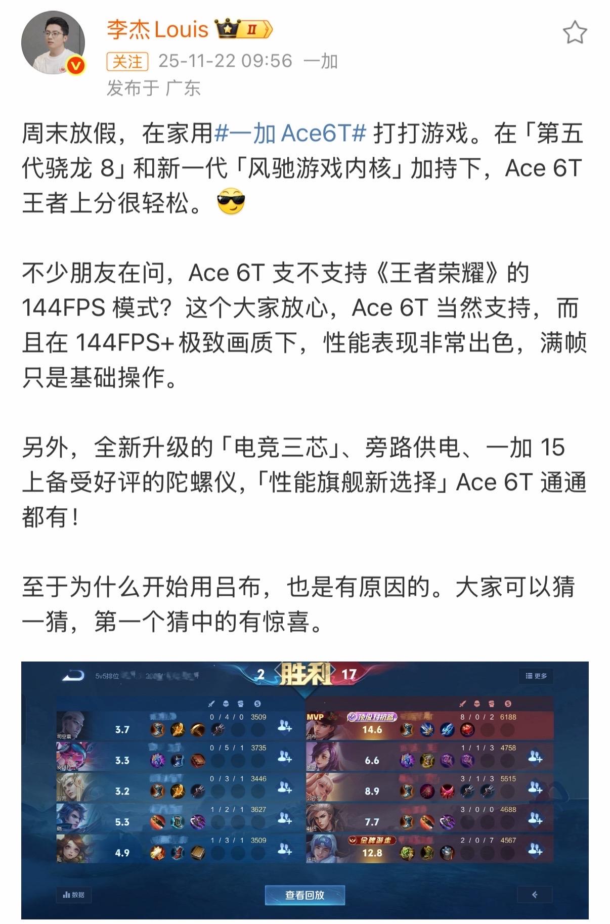 一加Ace 6T最近的爆料信息很多啊,预计本月发布,欢迎补充! - 骁龙8 Gen5处理器,GeekBench跑分单核3055,多核10460,安兔兔跑分3561559分 - 1.5K直屏、165Hz刷新率 - 超8000mAh+100W - 金属中框+玻璃后盖、超声波指纹识别、IP66/IP68/IP69/IP69K防尘防水、双扬声器、X轴线性马达、灵犀触控芯片、电竞网络芯片G2