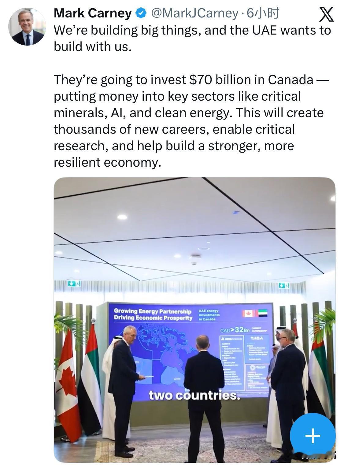 加拿大总理马克·卡尼(Mark Carney)近期访问了阿联酋,并与阿联酋领导人签署了促进和保护投资的双边协议,阿联酋已承诺根据一项新的双边投资框架协议,向加拿大投资高达700亿加元(约合500亿美元)。该投资将重点关注关键矿产、能源、人工智能(AI)、物流和其他战略产业。 加拿大政府希望利用这笔投资创造就业机会,提升关键矿产供应链能力,并促进人工智能和清洁能源等领域的发展。