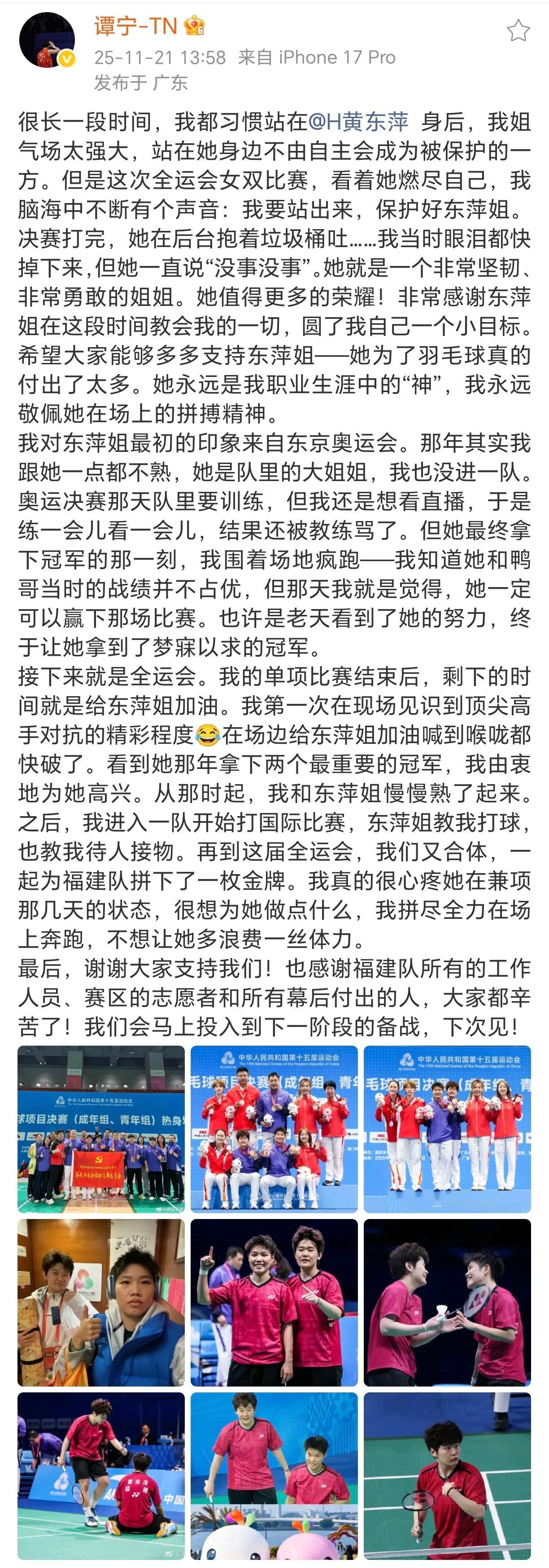 翻到了小谭宁21年的评论,谭宁太爱黄东萍了。从台下呐喊变成赛场保护,从看奥运直播到一起去奥运赛场,从小到大那么热烈又真挚的一直在姐身边。去年的生日祝福是希望姐少说她,今年的生日愿望是她姐少受委屈。队里大姐姐也有谭宁这个可爱、努力又稳重的后盾。
