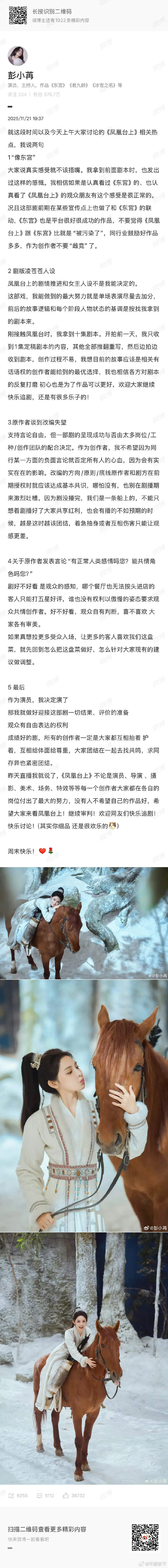 彭小苒这番话太戳人心啦!每部作品都愿花半年深耕,对创作满是敬畏。还感恩幕后人员,