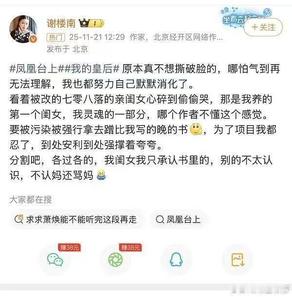 彭小苒硬刚凤凰台上的原作者,维护自己的作品起因于网友吐槽作者虐女,然后作者发数篇