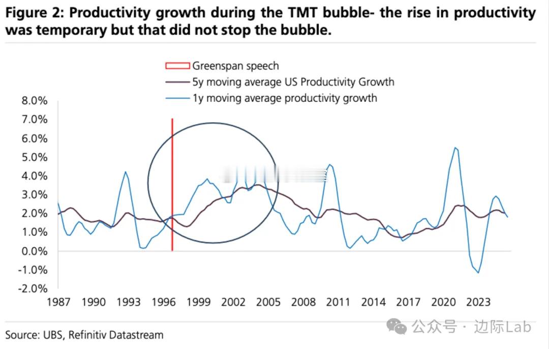 在2000年互联网泡沫期间,美国劳动生产率曾出现暂时性的大幅提升,其五年移动平均增速一度超过3%。这一轮由技术革命驱动的生产率跃升事后证明是短暂的,其并未阻止资产泡沫的形成。这一历史经验为当前由生成式人工智能(Gen AI)驱动的市场情绪提供了参照,即市场对资产的估值更多基于对未来生产率提升的“感知”而非现实。来源:瑞银(《全球股票策略:我们处于多大的泡沫中?峰值的警示信号是什么?》,详细内容请见《财经图集》知识星球)