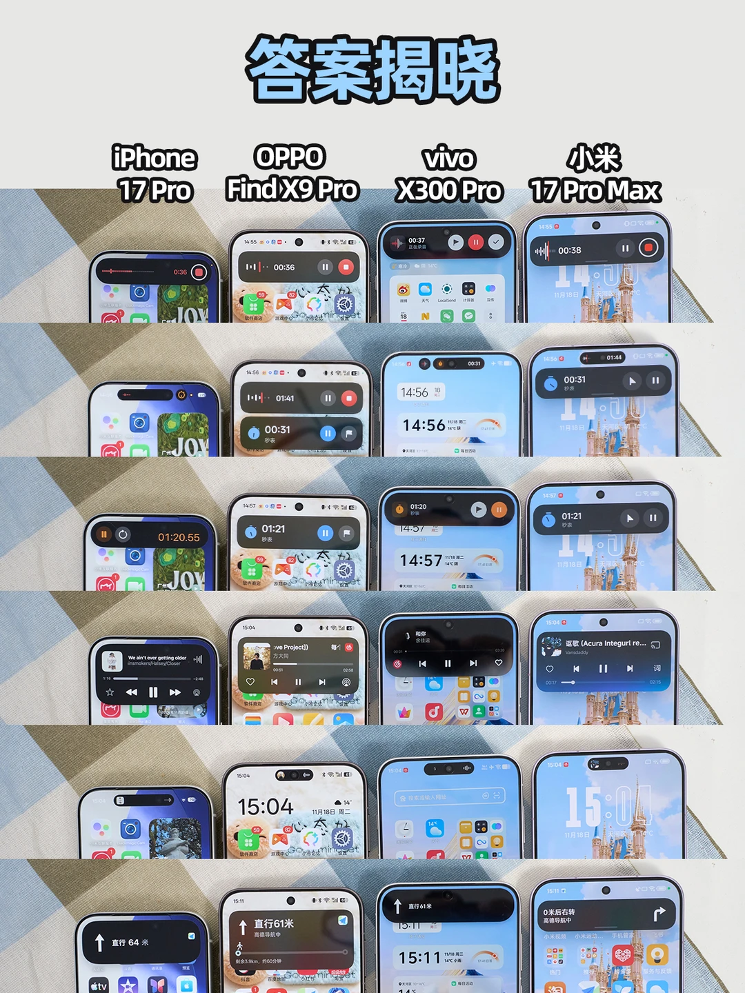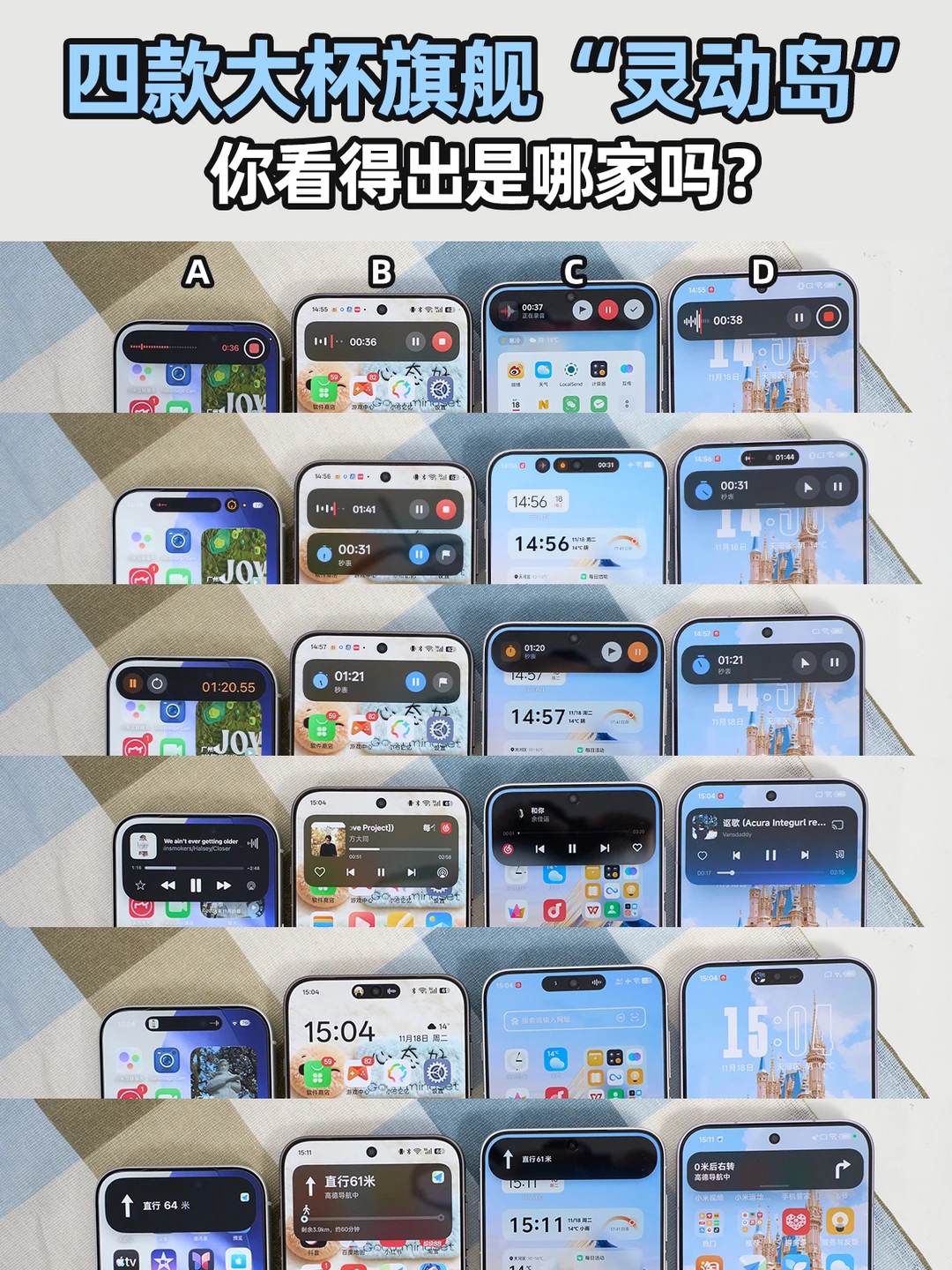 国产手机这边基本也有类似灵动岛的设计了,只不过大家的设计细节不同,比如有两个品牌的灵动岛会和顶部状态栏重合,有两个则是单独隔开,iOS和OriginOS是前者,ColorOS和澎湃OS是后者,你们喜欢哪一种?