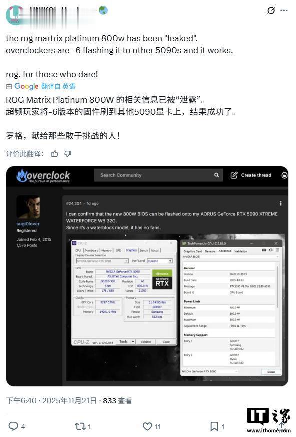 11月19日,不知名用户将ROGMatrixRTX5090显卡的BIOS公布到了网上,遂引发了一场“超频狂欢”,目前已经有多位高玩将其刷入到技嘉、微星、PNY等厂商的RTX5090显卡中。