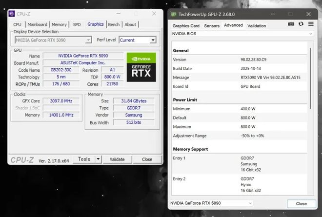 然而,这款显卡售价高达3999美元(IT之家注:现汇率约合28443元人民币)。因此,不少用户开始尝试将其BIOS刷入更便宜的RTX5090非公卡上,以解锁更高的频率与功耗墙。