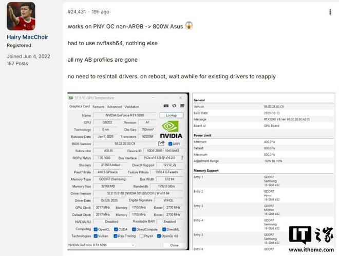 根据Overclock论坛用户测试,包括技嘉、微星、PNY等厂商的多款RTX5090型号已成功刷入该BIOS,包括但不限于: