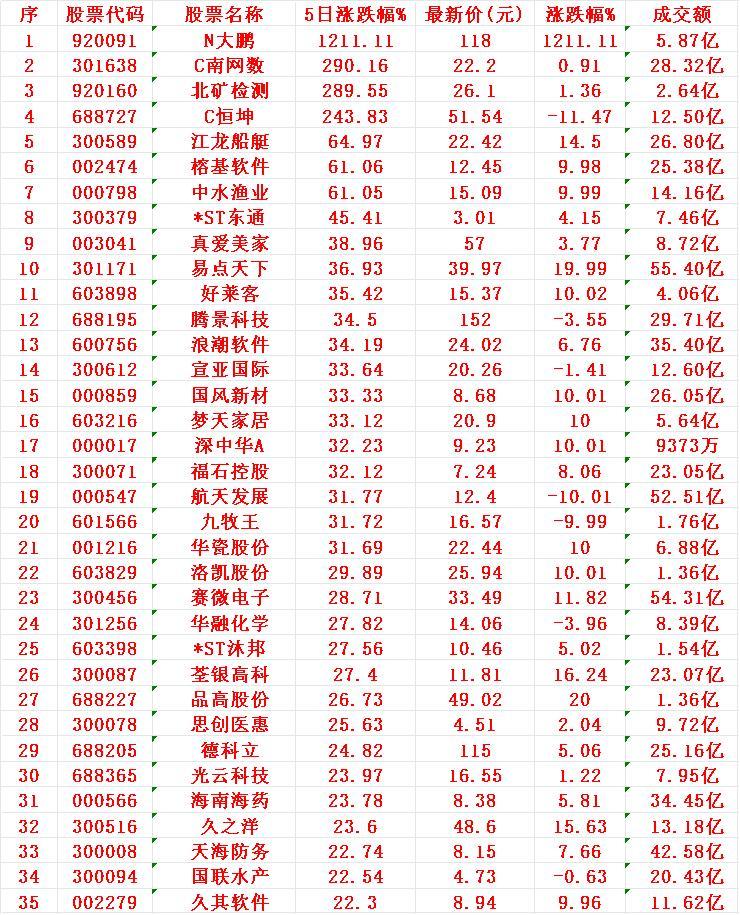 本周,整个市场“涨幅最多”的35名单汇总N大鹏:5日涨跌幅+1211.11%,最