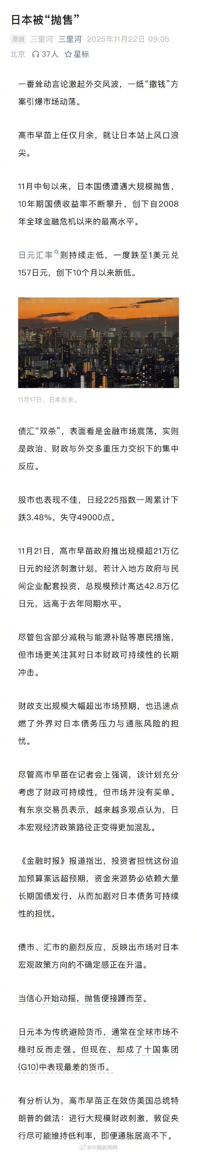 一番耸动言论激起外交风波,一纸“撒钱”方案引爆市场动荡,高市早苗上任仅月余,就让日本站上风口浪尖。近期,日本金融市场遭遇债汇“双杀”:国债遭大规模抛售,10年期国债收益率创下自2008年以来最高水平;日元汇率下跌,创10个月以来新低。11月21日,高市早苗政府宣布推出规模超21万亿日元的经济刺激计划,这一超预期的财政支出,再次加剧外界对日本债务压力与通胀风险的担忧。越来越多观点认为,在通胀、汇率下跌和经济增长乏力等多重压力下,日本宏观经济政策路径正变得更加混乱。()