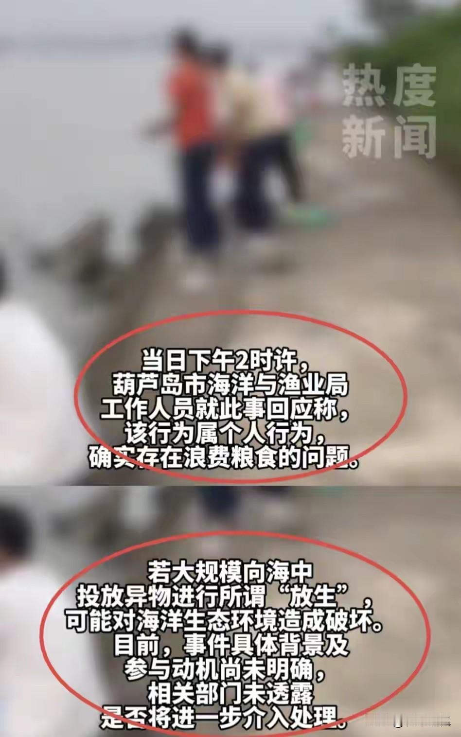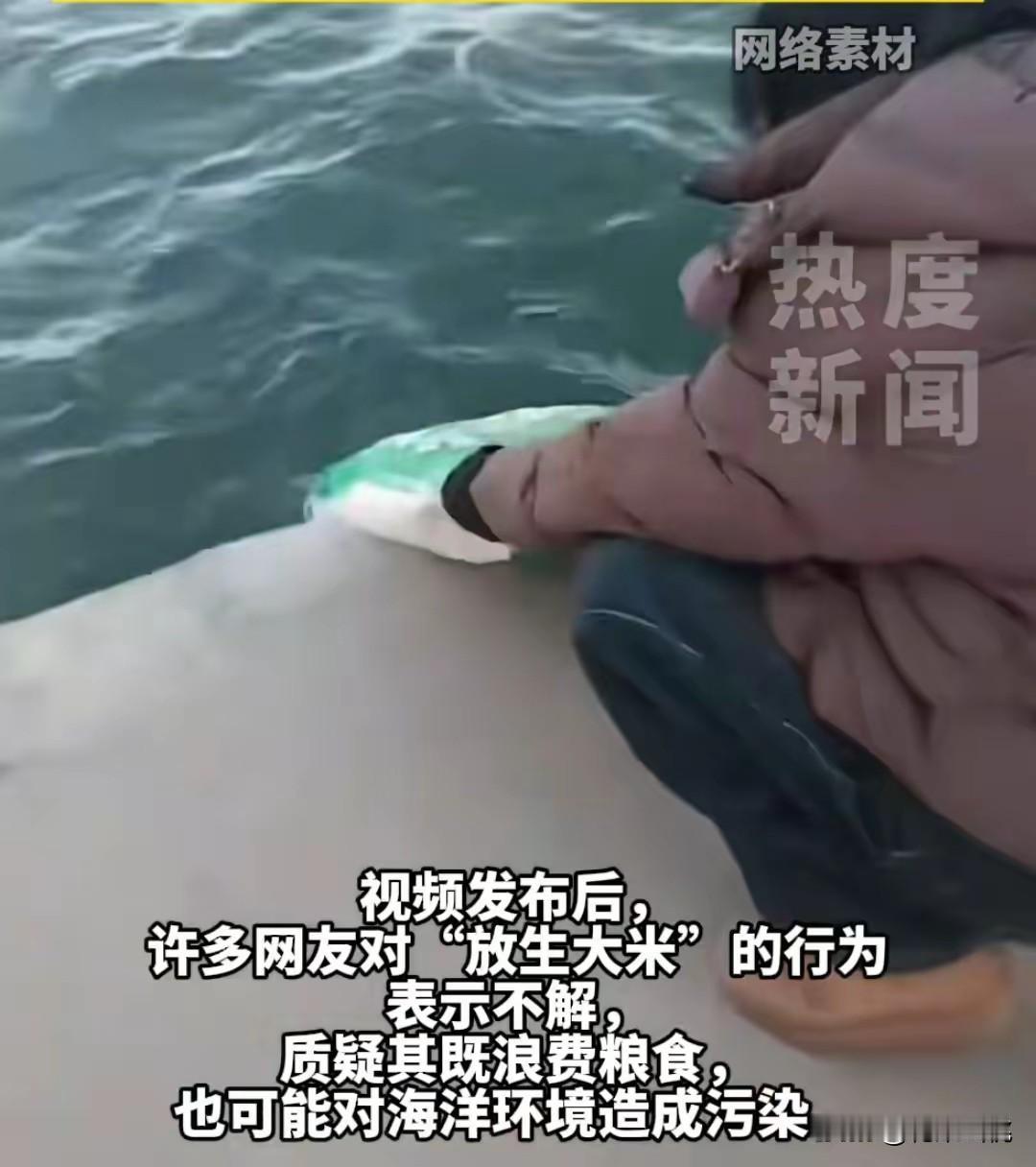 惊掉下巴! 把大米倒入大海,叫“放生大米”, 几位阿姨短短十几分钟就将十几包大米倒入海里,嘴里还念念有词。 这惊奇的一幕发生在11月20日,辽宁葫芦岛的一处海边码头,阿姨们毫不吝啬的将一袋袋大米倒入海里,可以看到海面上漂浮着米粒。 这些“放生”的大米难不成是要给鱼吃吗?可是鱼会不会吃大米呢,如果鱼不吃大米,岂不是浪费了。 一袋大米少说也要几十块钱吧,阿姨们如果是为了行善积德,倒不如将这些大米赠送给需要的人或者是机构,那才是真正的行善积德。 有网友表示担心,这些大米被海水浸泡着,时间久了就会变质腐败,产生的有害物质不知会不会对海水和海里的生物造成污染和伤害。 对此,葫芦岛市海洋与渔业局工作人员回应称:“该行为属于个人行为,确实存在浪费粮食的问题。”如果大规模向海里投放异物进行所谓的“放生”,可能会对海洋生态环境造成破坏。 目前,当地官方没有明确透露是否进一步介入处理。 话说“放生”不是指的活物吗,什么时候大米变成了活物? 再说,放生也应该顺应动物的生存规律和生活环境吧,不能胡乱放生,胡乱放生很可能会对环境造成破坏或污染的潜在危害。