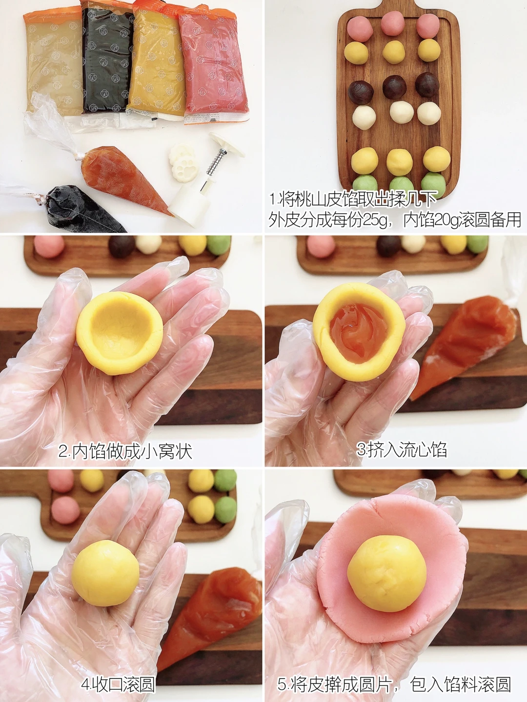 ❶先把桃山皮揉几下,然后分成外层桃山皮每份25g,内馅每份20g滚圆。