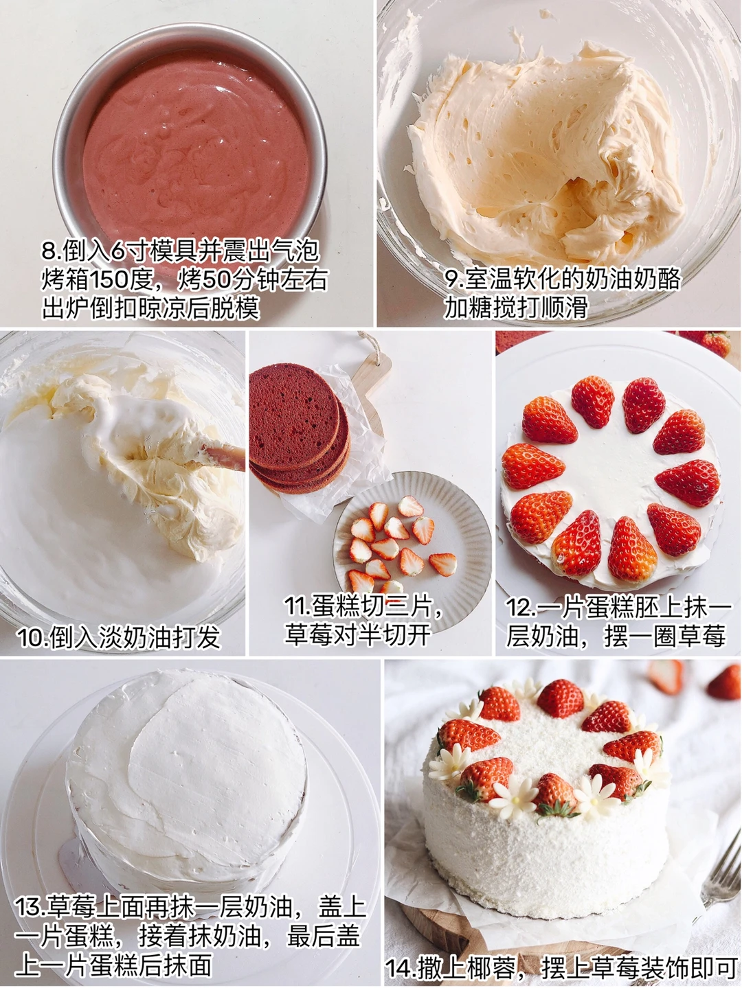 ❽一片蛋糕胚,抹上一层奶油,摆一圈草莓,再抹一层奶油,盖上一片蛋糕,接着抹奶油,坠后盖上一片蛋糕后抹面,撒椰蓉,摆上草莓装饰就好了