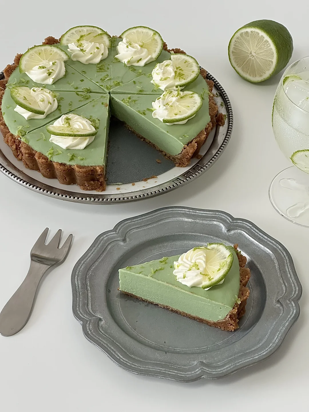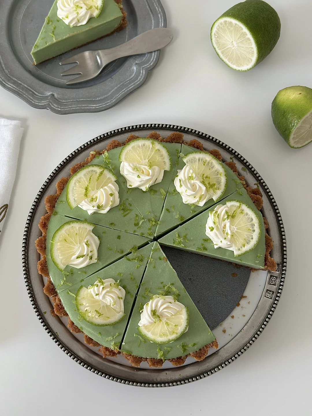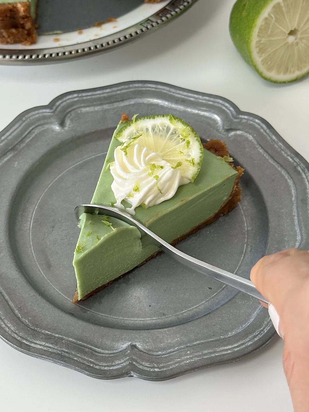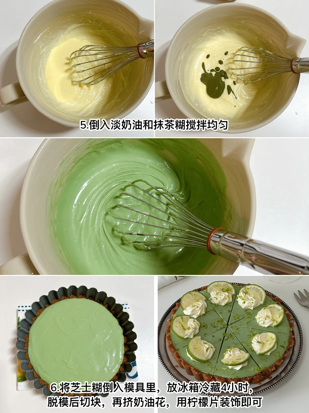 ❹再倒入淡奶油和抹茶糊(抹茶粉➕一点水调成糊)混合,然后倒入饼干底模具中,入冰箱冷藏4小时左右脱模