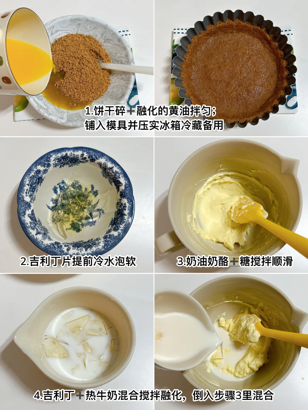 ❶饼干碎➕融化的黄油拌匀,铺入模具放冰箱冷藏