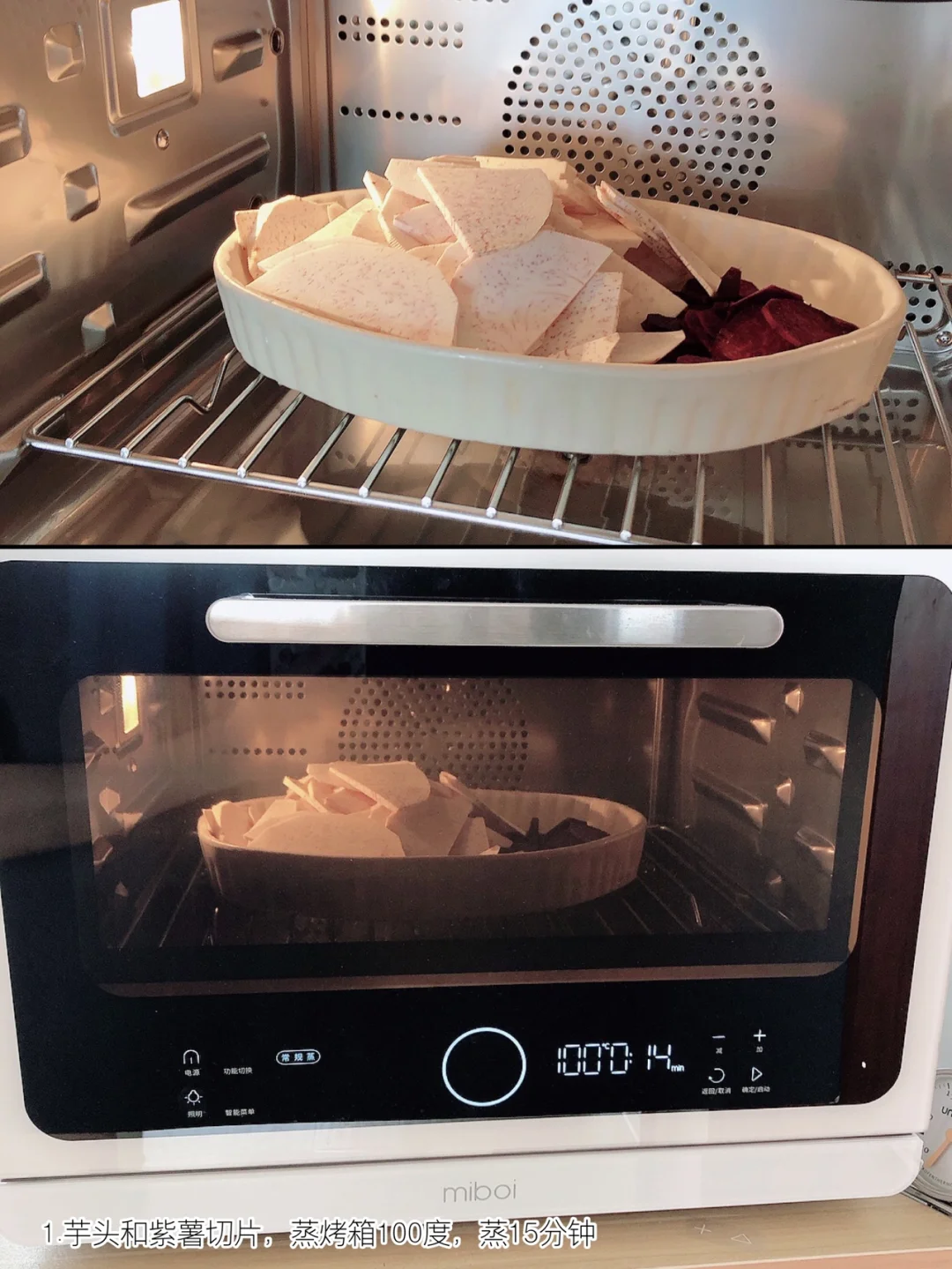 ❶芋头和紫薯切片,米博蒸烤箱100度,蒸15分钟。用这个蒸烤箱蒸东西,顶部不会滴水,省去了盖保鲜膜的麻烦。