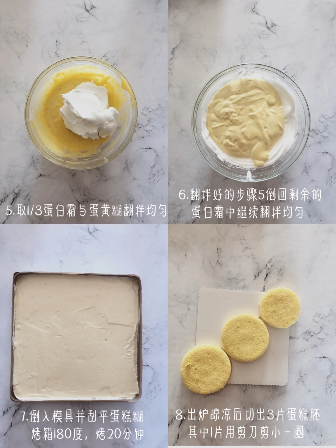 ❹倒入模具并刮平面糊,烤箱预热180度,烤20分钟左右。出炉晾凉后,用4寸切模切出3片蛋糕胚,其中1片用剪刀剪小一圈。(小的这片组装蛋糕时放在最上层)