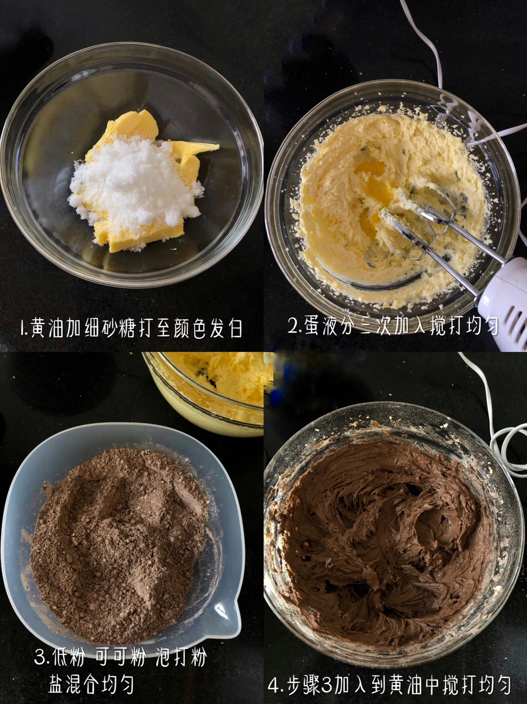 ❸低粉,可可粉,泡打粉,盐混合均匀加入到步骤2中,搅打至无干粉状态。牛奶分两次加入,每次搅打均匀再加下一次。然后倒入隔水融化的巧克力液搅打均匀即可。