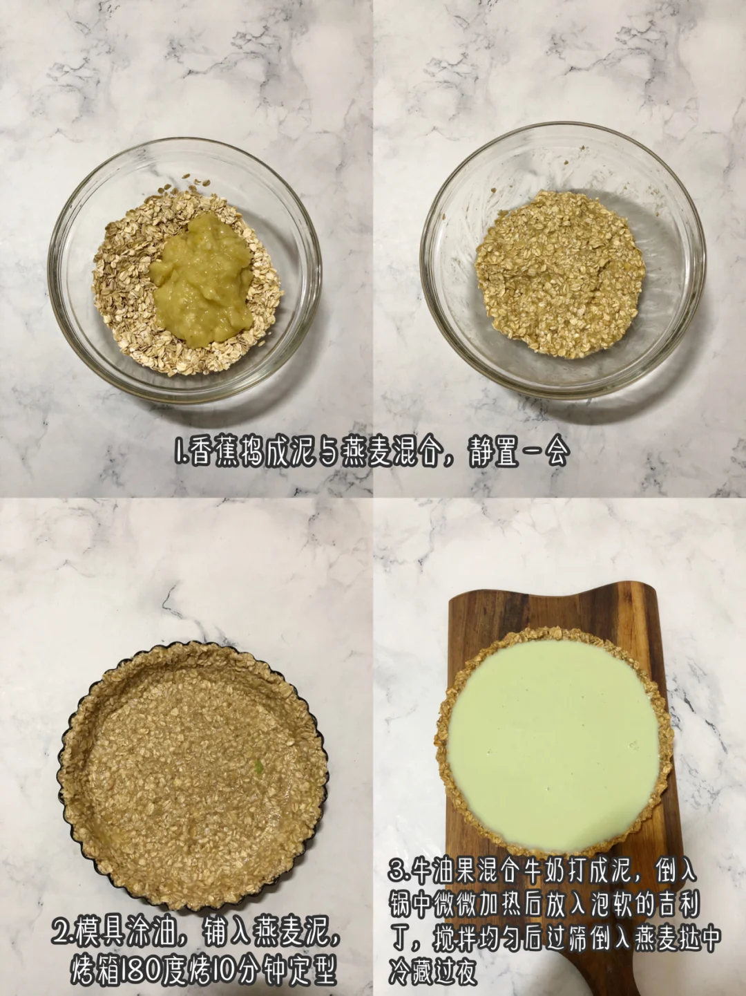 ❸牛油果混合牛奶打成泥,倒入锅中微微加热后放入泡软的吉利丁片,混合均匀后过筛倒入燕麦挞壳中,放入冰箱冷藏过夜即可。