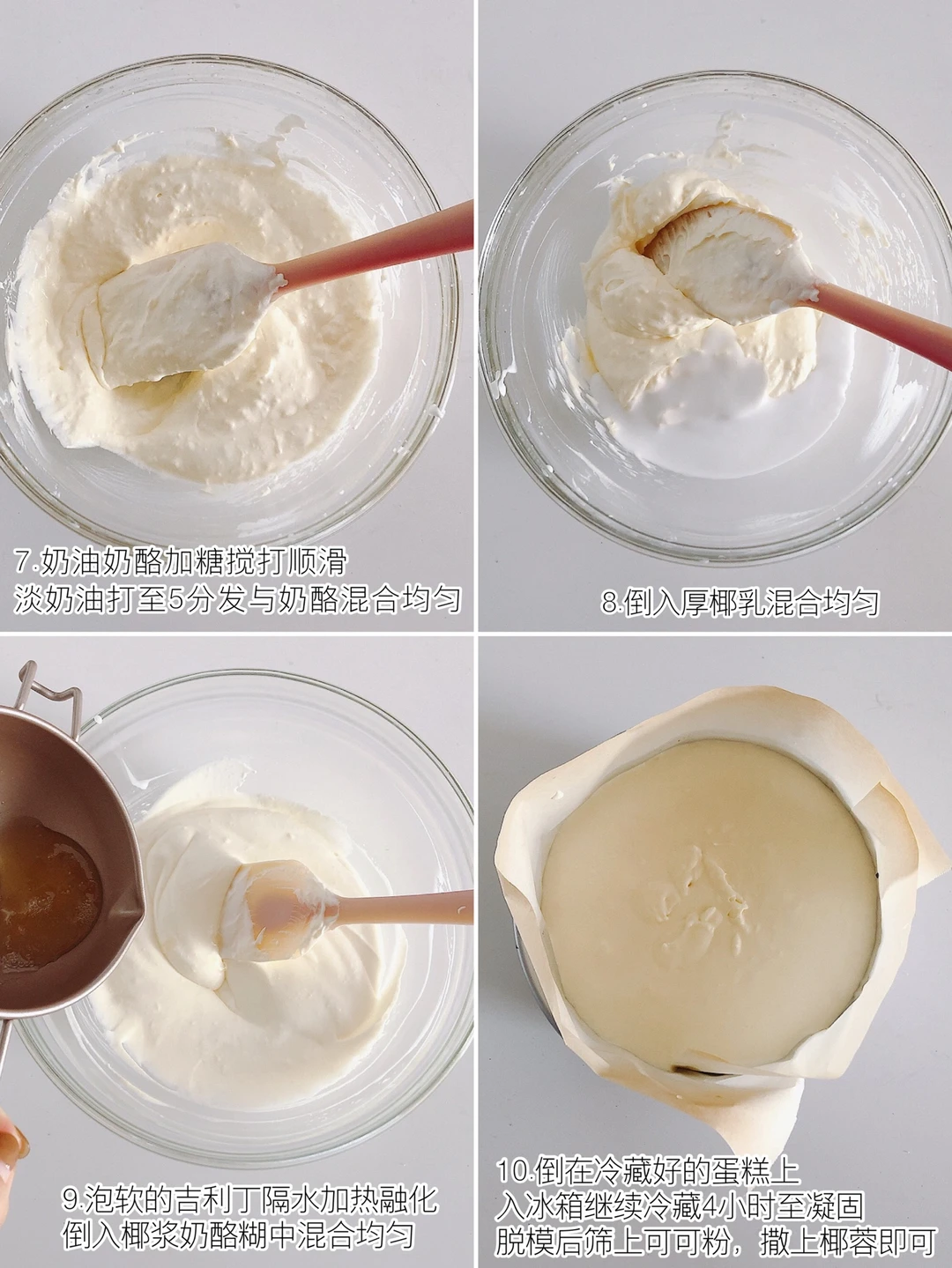 ❽泡软的吉利丁片隔水加热融化,倒入椰乳奶酪糊中混合均匀后,倒在巴斯克蛋糕上,冰箱冷藏4小时。